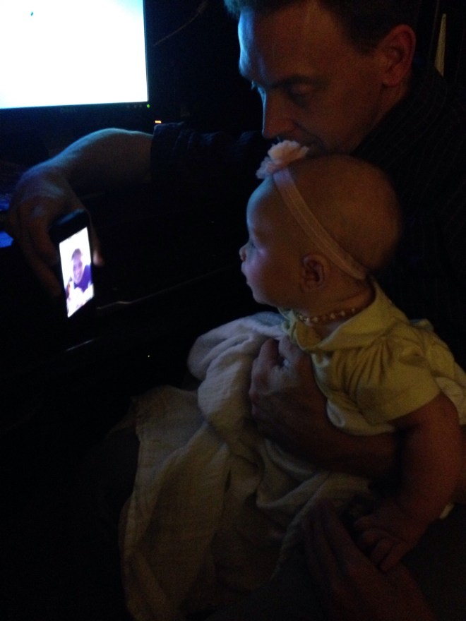Lucy got her first owie today. Not quite sure how she did it, but she now has a bruise on the right side of the tip of her tongue. I think she might have chomped her tongue between her teether and her gums. Luckily she does not seem too bothered by it. It just looks bad. She had a fantastic day today. For most of the day, Lucy was very happy, smiling a lot and even laughing several times. She was only fussy when she was getting tired, hungry, or the dog woke her up from her nap. Tonight, we face timed Brianna and Lucy really enjoy that! So nice to see Brie’s face.