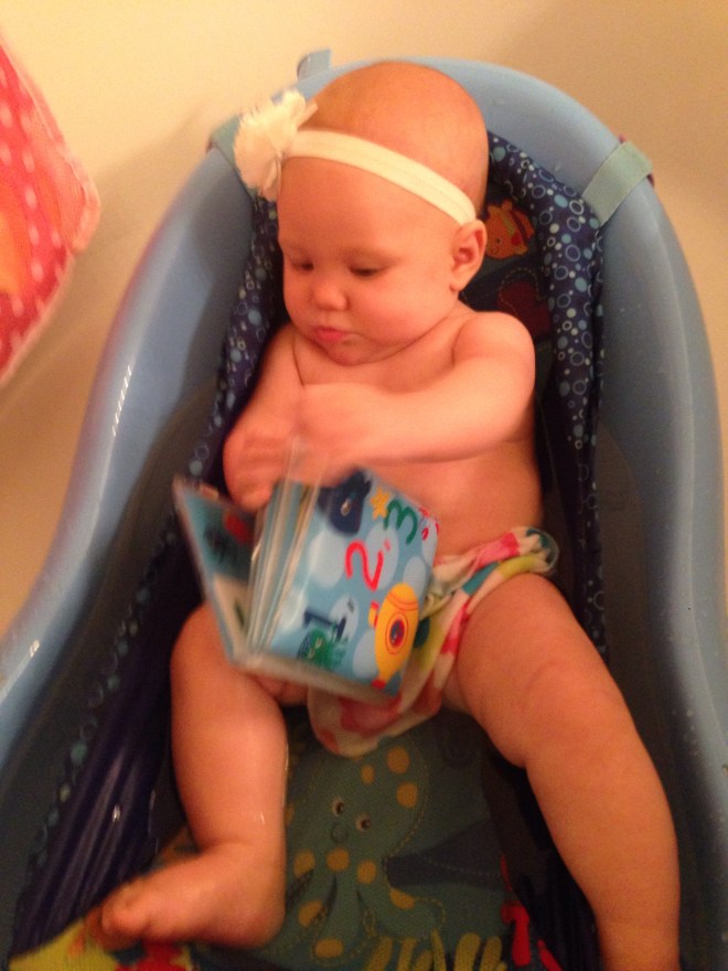 Sam’s friend Michael, from EDS, has a little baby girl just a few days younger than Lucy. This week Sam had lunch with Michael and his family gave Lucy a special surprise… Bath Toys! They are so incredibly cute! Tonight Lucy got to play with them for the first time, and she LOVED them, especially the bath book! She was talking away to it. We are so grateful to Michael, Brandi, and baby Maedreigh for the awesome gifts! That was so sweet of them!π