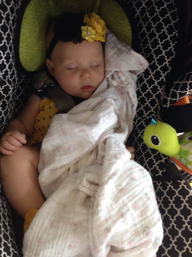 Lucy woke up at 5am this morning and would not go back to sleep. She really was acting like she was in pain. I fed her, walked with her, sang to her, and after an hour, she was still not back asleep. I needed to start getting the kids’ things ready for school, so I put Lu in her swing to see what would happen. She slept until almost 11:00! I think she prefers being elevated. When she woke up, she was super happy and enjoyed several minutes of looking at her hands. She was fascinated. π