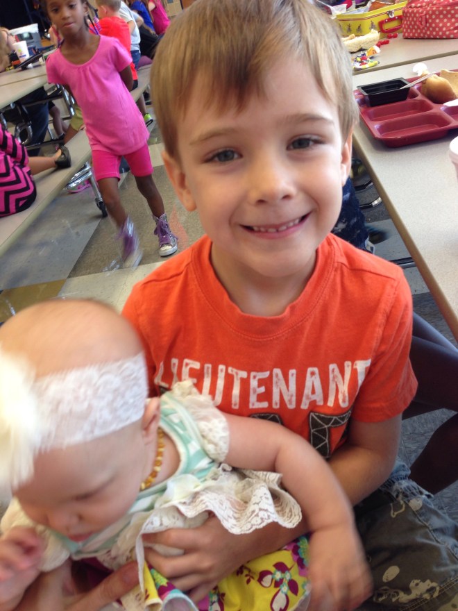 Today,Lucy and I had lunch with Alex. It is so funny how babies draw the attention of all the little girls. They were crazy for her, and Alex was so proud of his baby sister. It was SO cute! He kept telling all his classmates everything she could do. Lucy didn’t mind being the center of attention either. She loves to smile. βΊοΈ Too bad she wouldn’t sit still for a picture. (I think Alex needs a haircut! π)