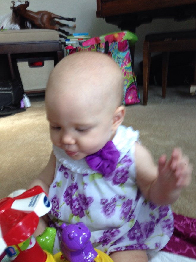 When Lucy woke up, she was ready to play. Her absolute favorite toy right now is this darn VTech carousel that her Aunt Emily gave to her. Lucy loves it so much, but it is really age inappropriate for her. It is made of hard plastic, and often falls in her face. Lucy tries to play with it, but often times gets very frustrated and starts yelling at it. I’ve tried to hide it to avoid such issues, but when she catches a glimpse of it, her arms and legs start swinging and she starts panting for it. If I walk away without letting her see it, she will start to cry.