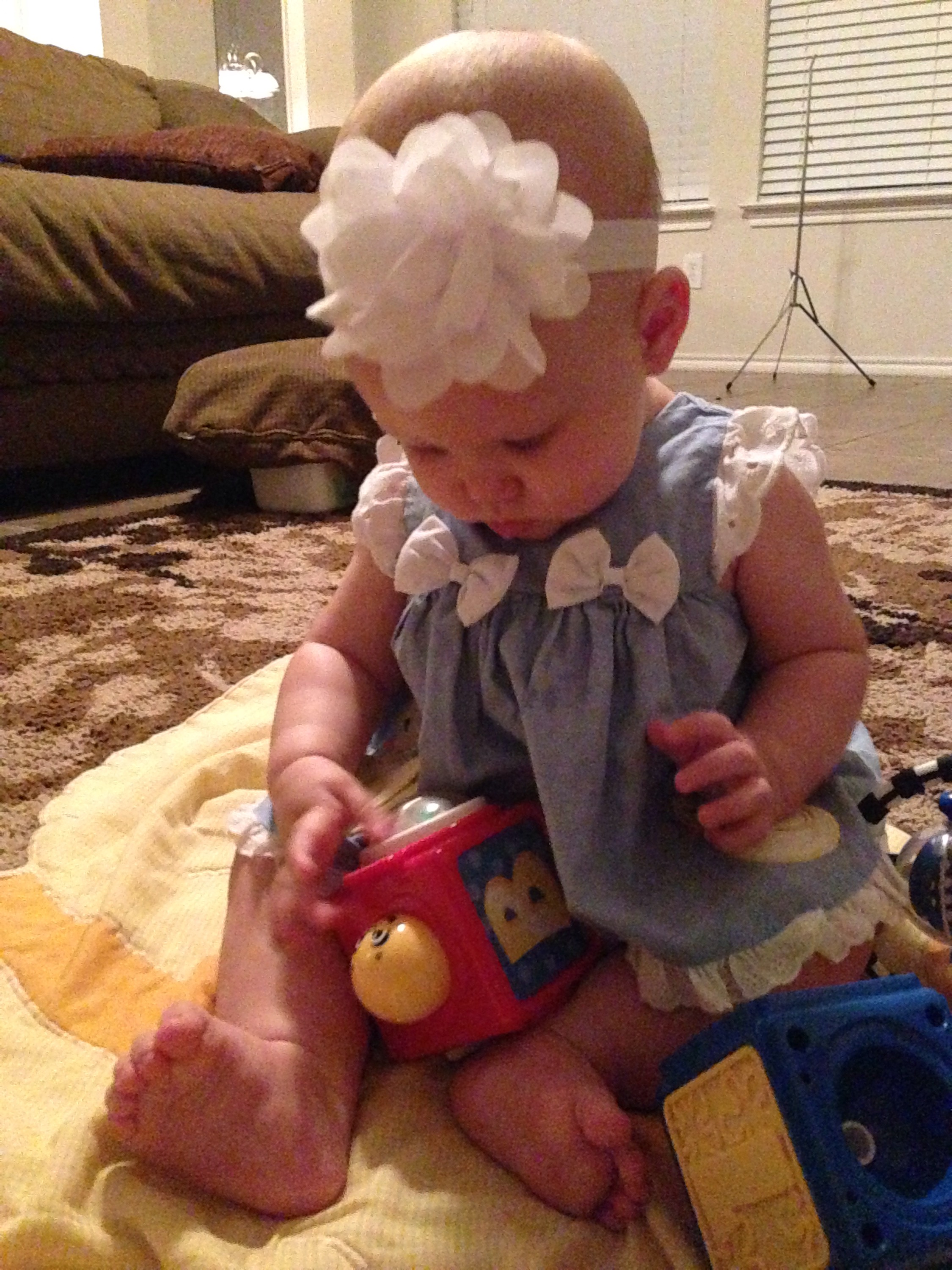 Wow! What a rough night. I don’t think I even got 3hours of sleep last night. Lucy just seems miserable. It still seems like she is teething, but nothing is showing yet. Today it really seemed like her upper guns were swollen and she was holding her mouth really funny. I cannot see anything at all though. I have even been trying to see if she has thrush instead. But I don’t see anything that looks like it. I am hoping that whatever it is, it goes away soon. She is so tired and cranky. She needs a break. I was able to capture a few happy moments tonight with her when Nana was visiting us. Lucy really enjoys when the kids play with her. I Love the excitement she has for them. πβ€οΈ