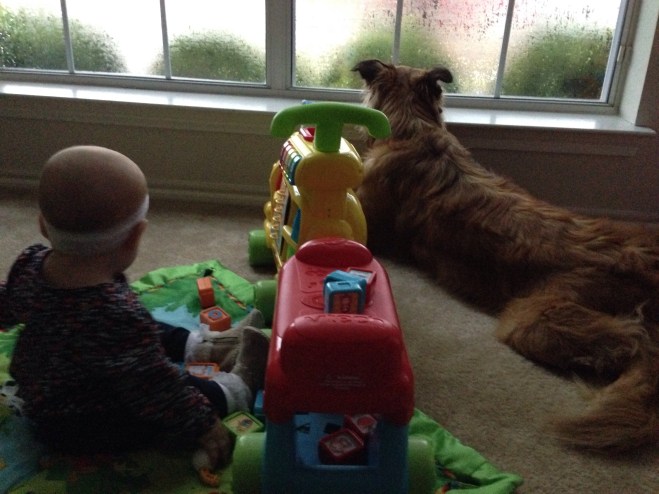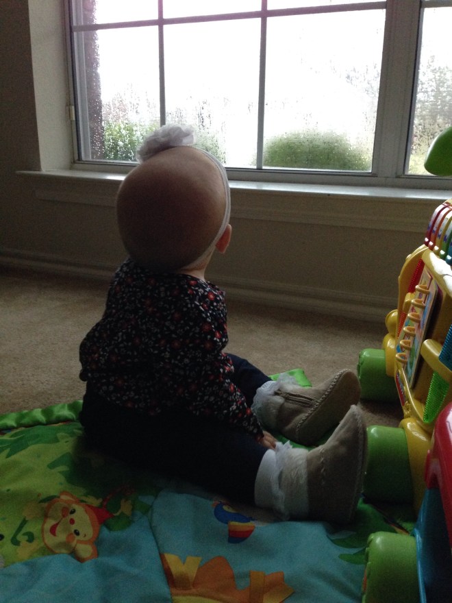 Wow! It was really raining in North Texas today! Several times during the day, our street looked more like a river than a road. When Lu was first born we had a period of very excessive rain. After that, we have not had much at all. Lucy was quite mesmerized by all of it when she got up this morning.