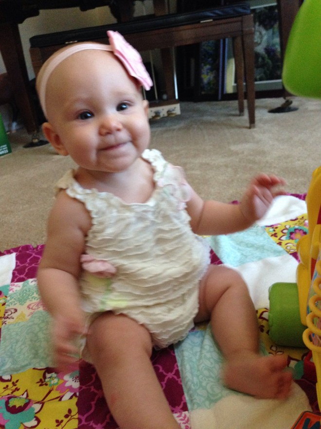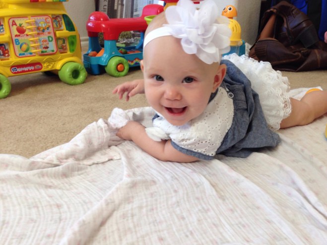 At five months: You LOVE to smile! People are always commenting on how happy you are and how much you smile. (So different from a couple months ago. π We really had them fooled, huh!) You still LOVE Piano Guys Jurassic Park. I am thinking one day this will not be the case, and the novelty will wear off. But for now, it is still a pretty sure thing to use if you are crying in your car seat. I think your siblings are sick of it though. They have heard it a few hundred times. Now you will sometimes cry if the song ends. We have figured out how to put the disc player on repeat, just for you. Your favorite toy is your VTech Merry Go Round, and the kitchen sink. If you see either, your arms and legs get going and we have to stop and play. You are also in love with Khaliyah. What was a major dislike a few months ago is now a sweet bond between you and her. She definitely knows her licking limits now. You are beginning to clap, and can sit very well unassisted. You also love to roll all over the floor. You are beginning to really scoot, but you oftentimes end up somewhere you were not wanting to go. The coordination will come soon enough. You LOVE Mommy, and if anyone else is going to hold you, I usually cannot be in sight. You probably have the earliest separation anxiety of any Hardy kidlets. Some of that might be due to being uncomfortable too. Sleeping, well, you usually have 2 really good daytime naps. One about an hour after you wake up in the morning, and the other around 1:00. The rest of the day depends on the other kids’ schedules. Nighttime is a whole different ball game. Let’s just say sleep really is not happening much. I am so hoping this changes soon because Daddy and I are getting pretty exhausted! You weigh 15lbs 3oz but I’m not sure how long you are. I’ll have to check when you are not napping. You still nurse every 2 hours, but sometimes it varies depending on your mood and activity. You can say Mama very well, but all other sounds have stopped for now. Teething changes all kinds of milestones. I love you so much! You are such an amazing little girl. I cannot wait to see and experience all the new things you’ll learn and do in the months ahead! Happy 5 months Lulu Pie! βΊοΈ