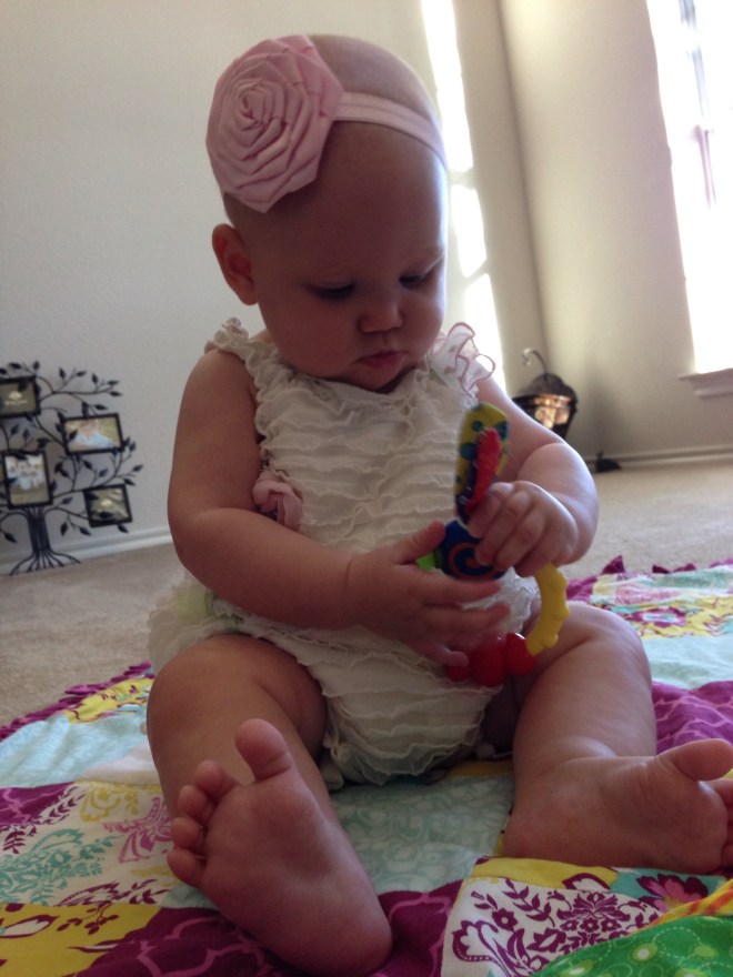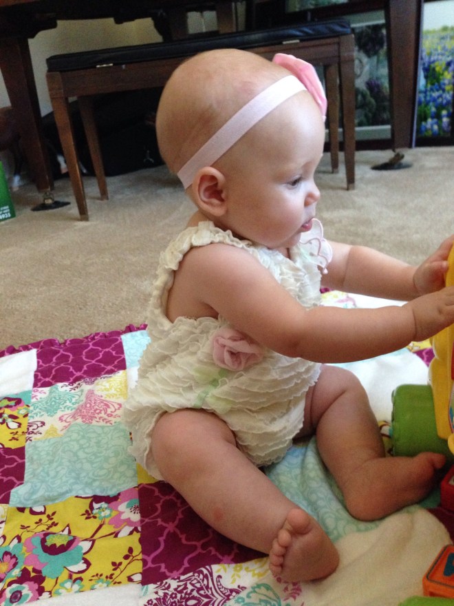 Daddy spent most of the day with her after that. I was able to squeeze in a little playtime after feeding her in the afternoon, before I took William fishing for his date night. She seems like she is going to just take off any day. She wants to get places so badly. If her body would just cooperate.