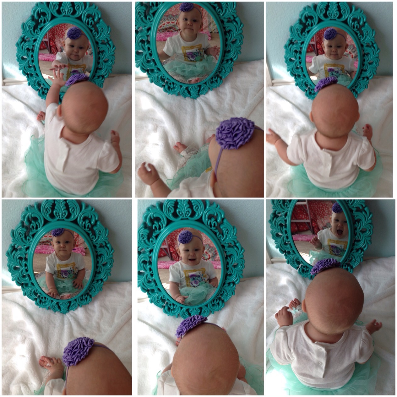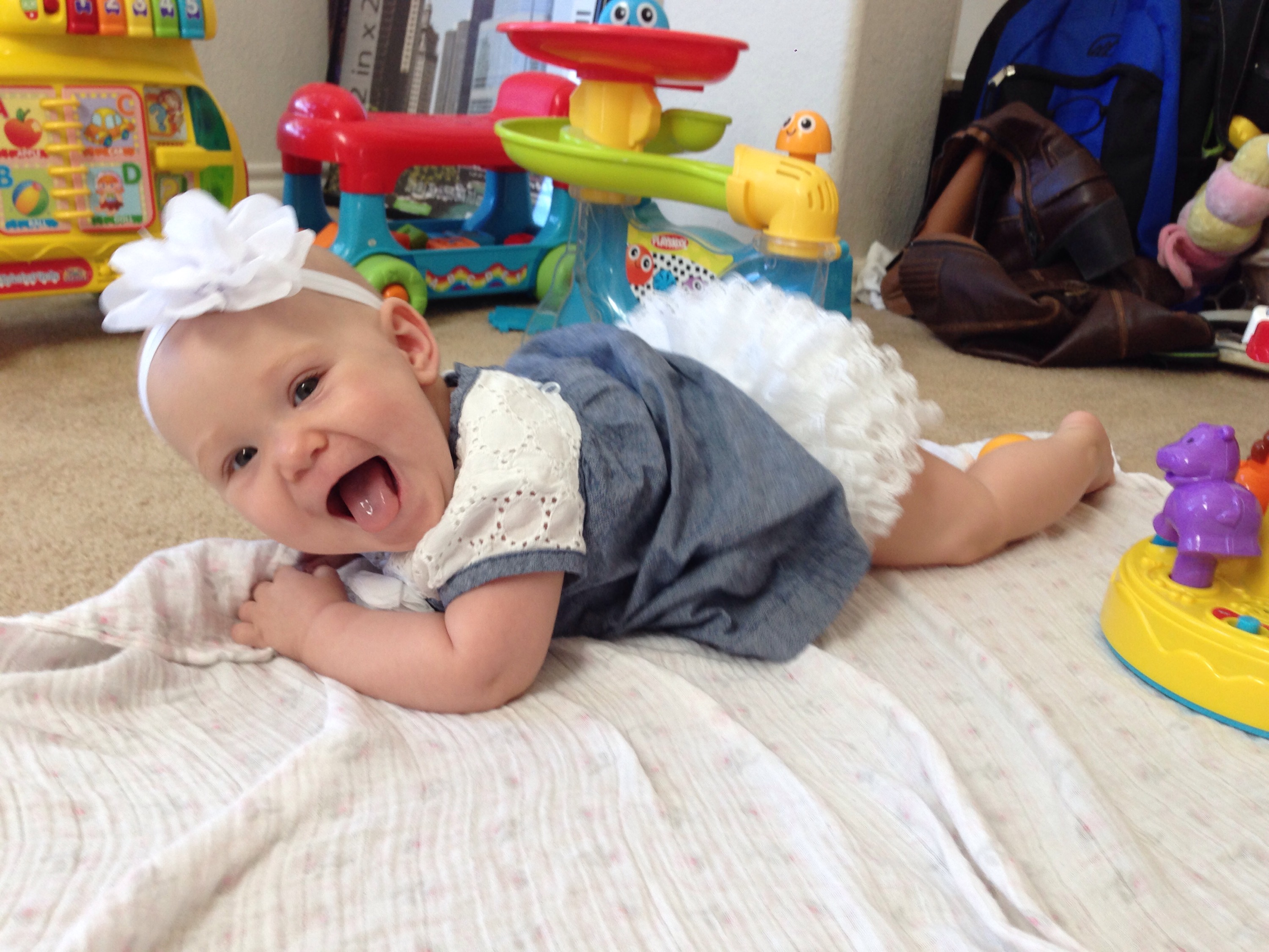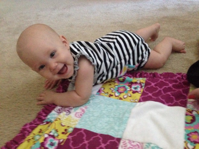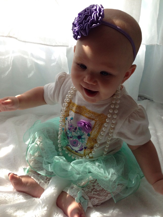 At five months: You LOVE to smile! People are always commenting on how happy you are and how much you smile. (So different from a couple months ago. π We really had them fooled, huh!) You still LOVE Piano Guys Jurassic Park. I am thinking one day this will not be the case, and the novelty will wear off. But for now, it is still a pretty sure thing to use if you are crying in your car seat. I think your siblings are sick of it though. They have heard it a few hundred times. Now you will sometimes cry if the song ends. We have figured out how to put the disc player on repeat, just for you. Your favorite toy is your VTech Merry Go Round, and the kitchen sink. If you see either, your arms and legs get going and we have to stop and play. You are also in love with Khaliyah. What was a major dislike a few months ago is now a sweet bond between you and her. She definitely knows her licking limits now. You are beginning to clap, and can sit very well unassisted. You also love to roll all over the floor. You are beginning to really scoot, but you oftentimes end up somewhere you were not wanting to go. The coordination will come soon enough. You LOVE Mommy, and if anyone else is going to hold you, I usually cannot be in sight. You probably have the earliest separation anxiety of any Hardy kidlets. Some of that might be due to being uncomfortable too. Sleeping, well, you usually have 2 really good daytime naps. One about an hour after you wake up in the morning, and the other around 1:00. The rest of the day depends on the other kids’ schedules. Nighttime is a whole different ball game. Let’s just say sleep really is not happening much. I am so hoping this changes soon because Daddy and I are getting pretty exhausted! You weigh 15lbs 3oz but I’m not sure how long you are. I’ll have to check when you are not napping. You still nurse every 2 hours, but sometimes it varies depending on your mood and activity. You can say Mama very well, but all other sounds have stopped for now. Teething changes all kinds of milestones. I love you so much! You are such an amazing little girl. I cannot wait to see and experience all the new things you’ll learn and do in the months ahead! Happy 5 months Lulu Pie! βΊοΈ