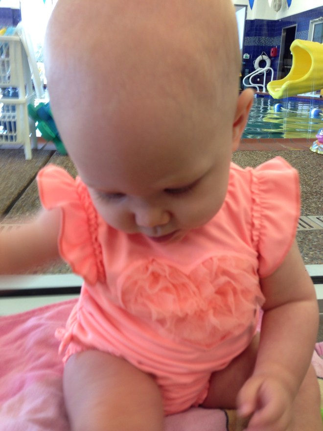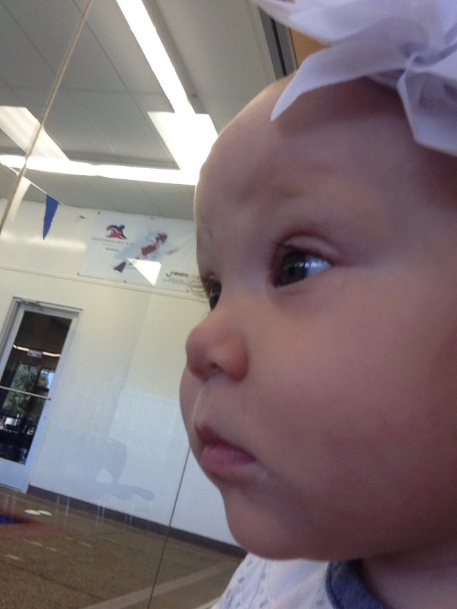 Lucy had her first swim class today. It was FABULOUS! Mrs. Brandi let us know about these awesome “Bathtime Babies” classes that Elmer Swim School does, and they are so neat. One major perk is that they are Free! We get to go until January. Lucy was so fascinated waiting for her class. It was so cute to watch her face in anticipation for her turn.