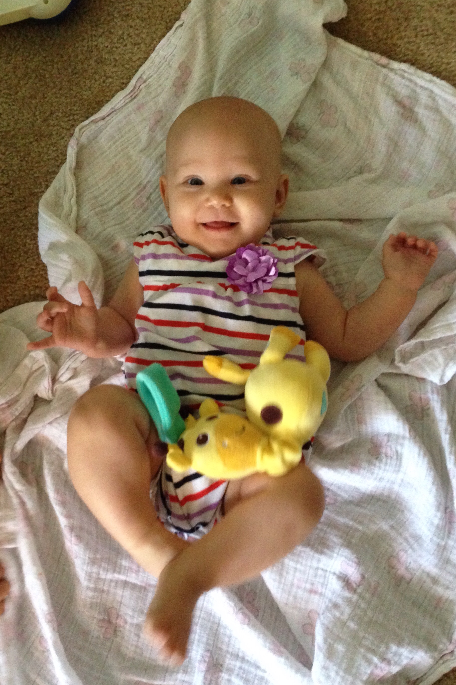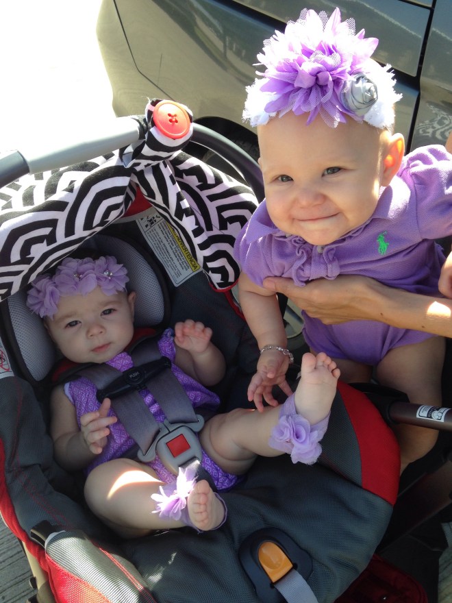 I have had a lot of time to ponder today on how blessed I am to have such amazing children, and such a special blessing Lucy is in our family. Today, a dear friend of mine is fighting a cancer battle with her precious two year old little girl McKenzie. I have realized, while learning of how quickly their lives have changed through their trials, how much I need to count every blessing, even when it might not be easy. Today, Lucy had quite a rough day. I really think she is trying to cut teeth, but it still makes it challenging when she just wants to be held all day long. I want to be there for her every moment, but have realized that sometimes I have to put her down. I ate lunch at 4:00 because I was trying to put off setting Lu down. I knew she would cry, which she did. Also, earlier this morning, we were going to story time with Maedreigh and Mrs. Brandi. Lu woke up at 9, ate at 9:20, and story time started at 11. Usually Lucy LOVES story time, but today she realized she was hungry in the middle of it, and could not get past that thought. I ended up having to take her out early because she got so upset. She has been biting her hands, sucking in her lower lip, and just acting agitated. Once she ate, she was a bit of a happy camper for a little while. It was so sweet. Mrs. Brandi had Mardreigh dressed in the cutest purple outfit. She did not even know we were wearing purple today in support of Kenzie’s battle. It made for the cutest first picture of the girls.