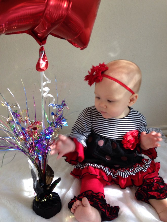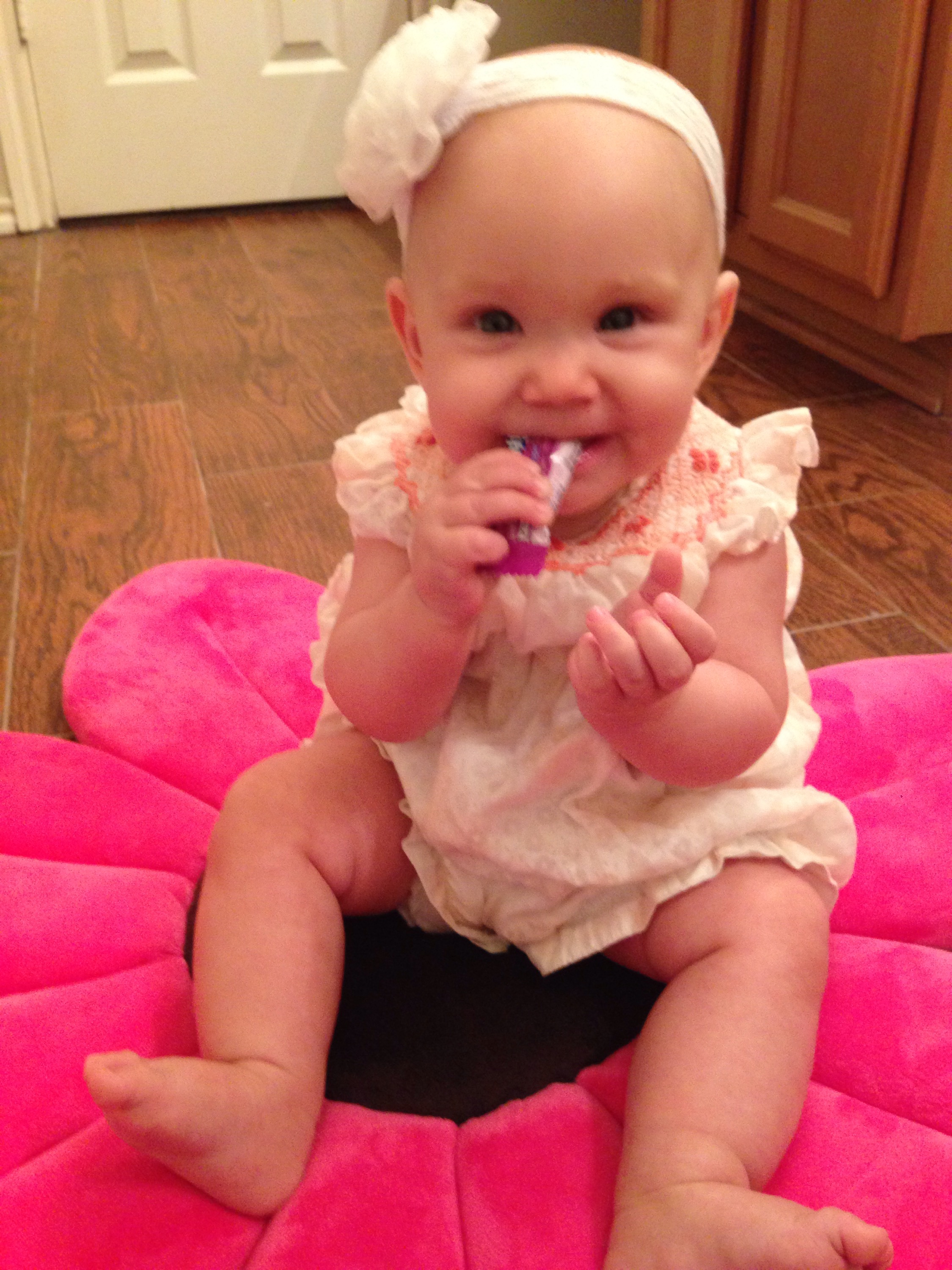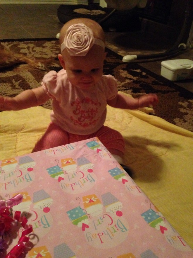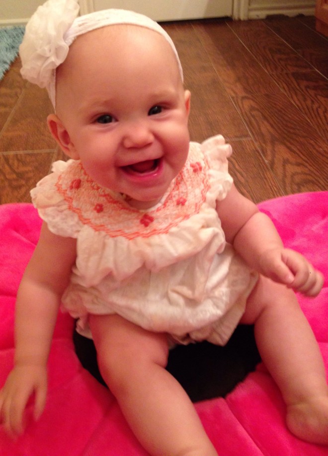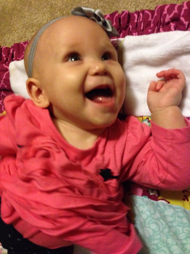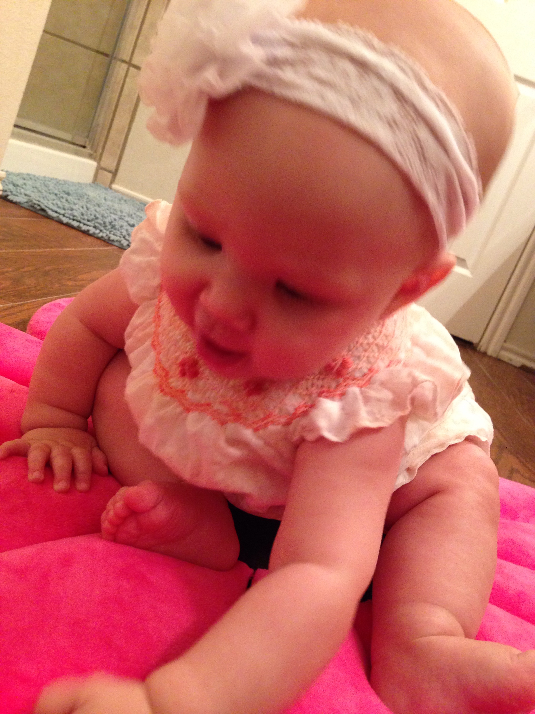 After she woke up (2 hours later), I wanted to get a few pictures of her on her birthday. Poor baby girl is just not smiling much at all right now. Her mouth is making her pretty miserable. I feel so bad for her. You can see the teeth on the bottom and top, just below the skin, but they still are not out yet. Of course the smiles we did get blurred. We’ll just have to wait for better shots from her 6 month session on Friday. Hopefully she’ll be happy then.