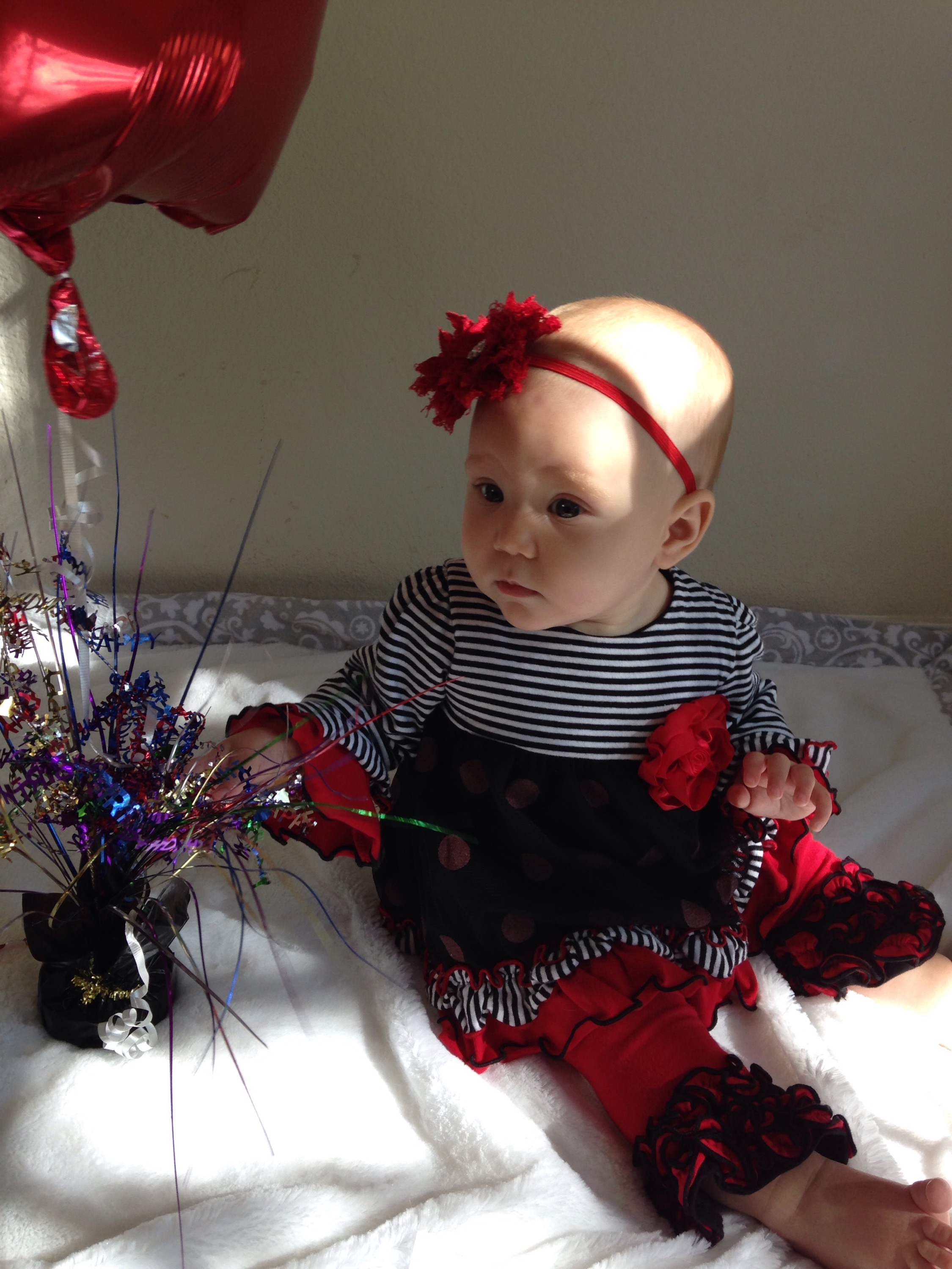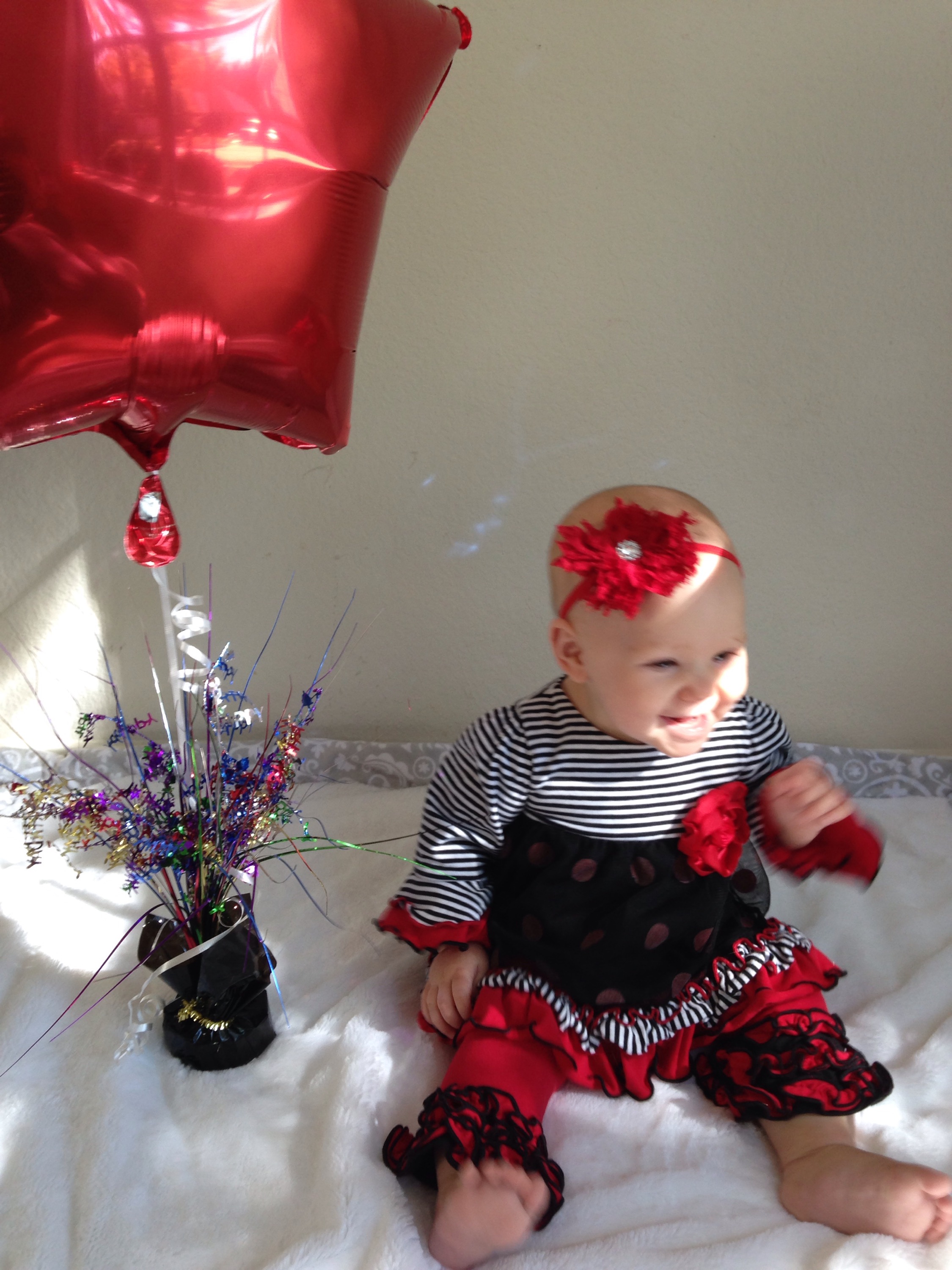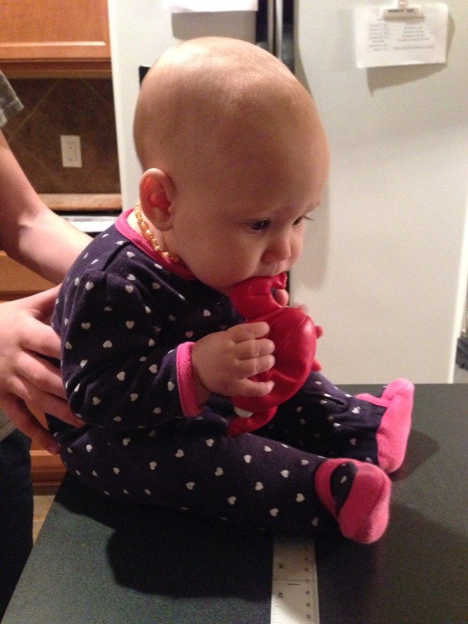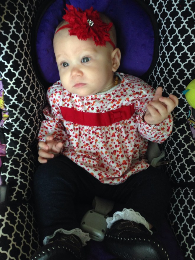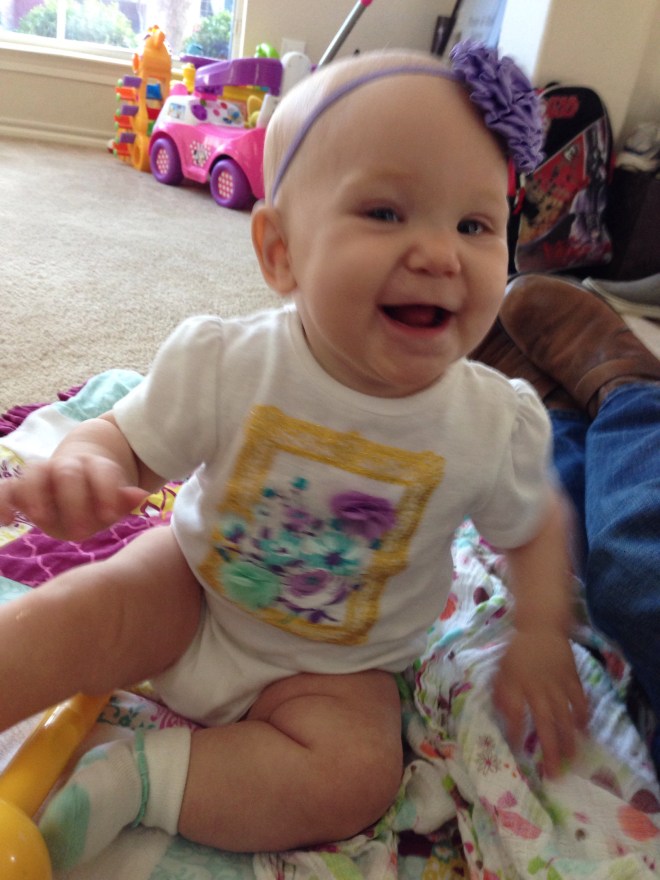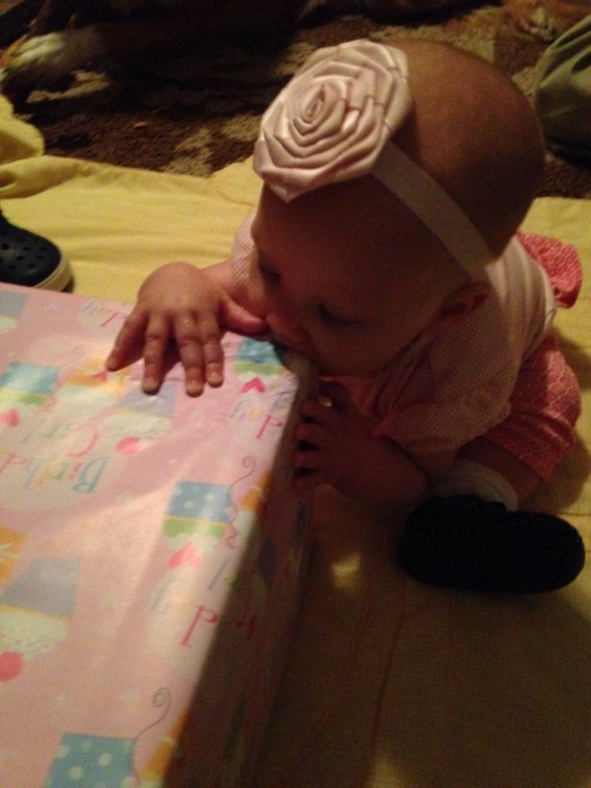 After she woke up (2 hours later), I wanted to get a few pictures of her on her birthday. Poor baby girl is just not smiling much at all right now. Her mouth is making her pretty miserable. I feel so bad for her. You can see the teeth on the bottom and top, just below the skin, but they still are not out yet. Of course the smiles we did get blurred. We’ll just have to wait for better shots from her 6 month session on Friday. Hopefully she’ll be happy then.