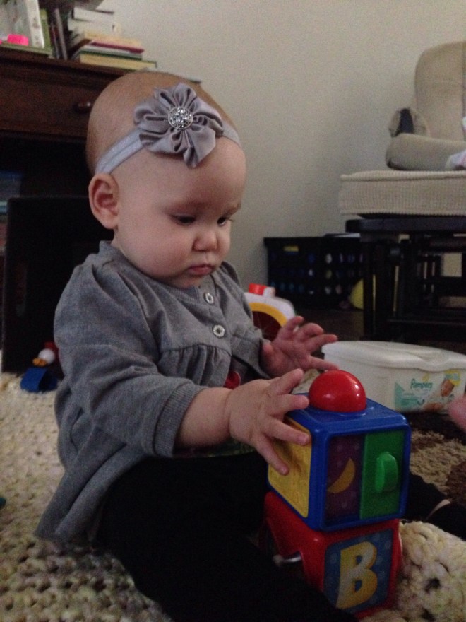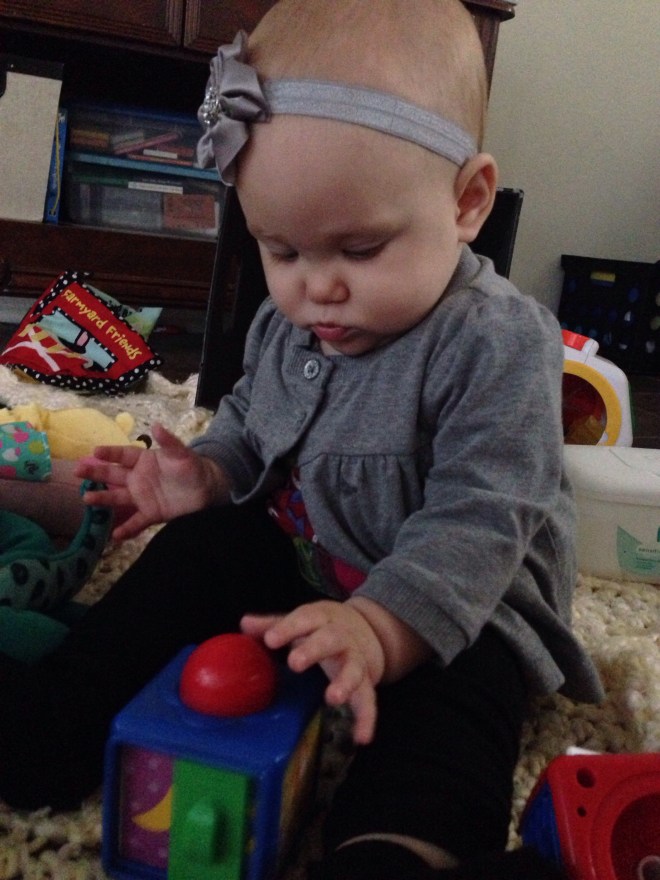 Lucy likes to play this “game” with her toys now that I think is so funny to watch. She will have a toy that she doesn’t want to play with at the time that will be sitting right next to her. She will play with the toys she wants to play with, but continue to look back at the other toy still sitting next to her and STARE at it for a few moments, then go back to playing with her other toys again. It is absolutely hilarious to watch when you realize what she is doing. Tonight, she did it for over 10 minutes with this little horse.