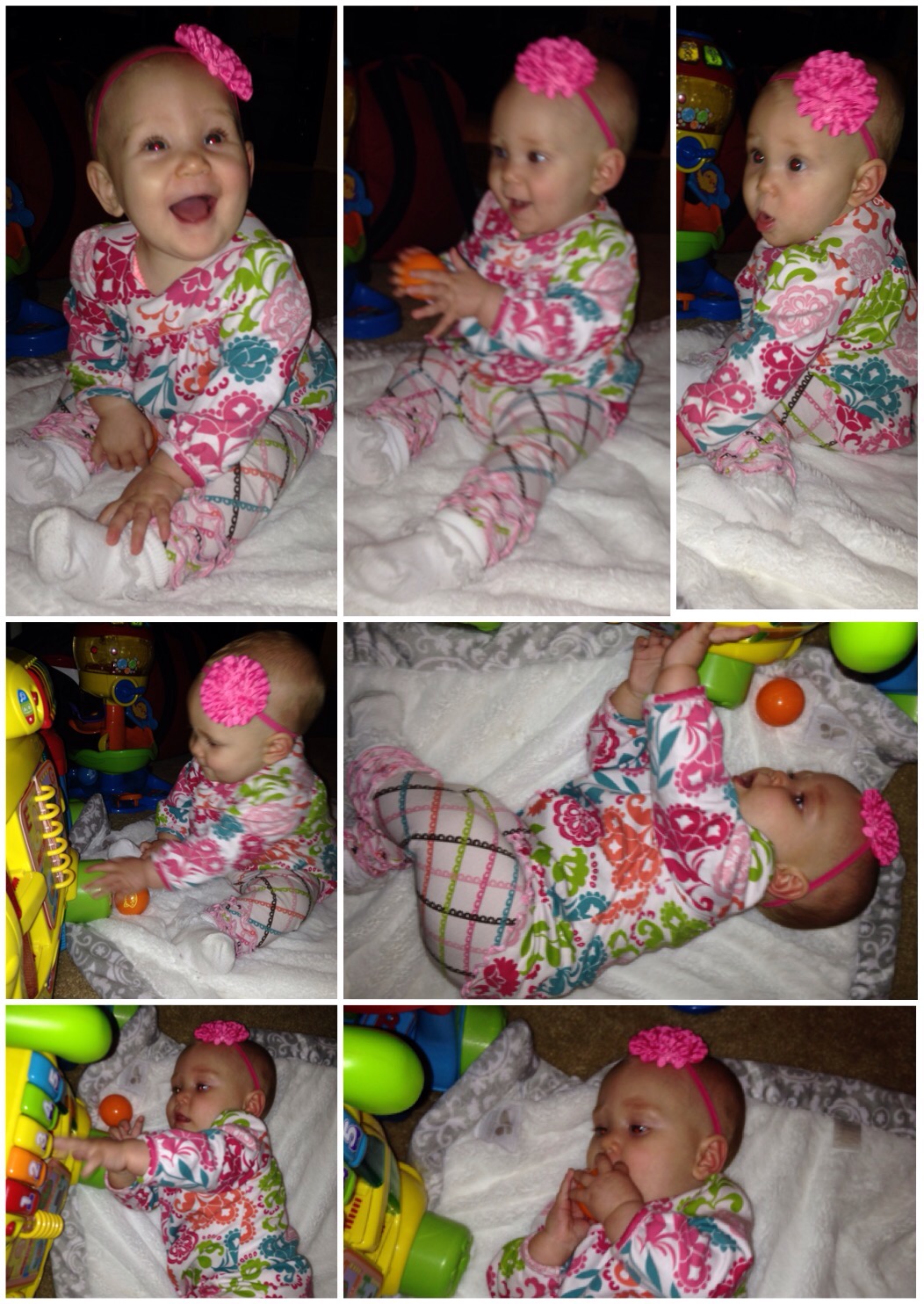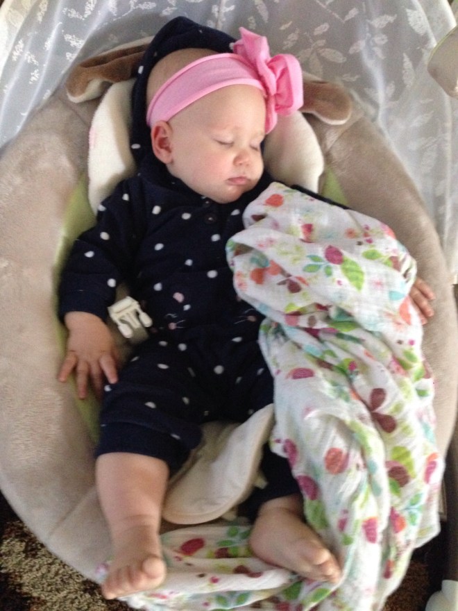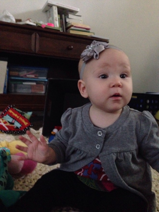 She also played “lost and found” with her wash cloth while I took my shower. She would intentionally drop her wash cloth on her tummy, while she was sitting in her bouncer, then right away feel around for it and snatch it up to her mouth again. She did this over and over. Funny girl. It kept her happy though.