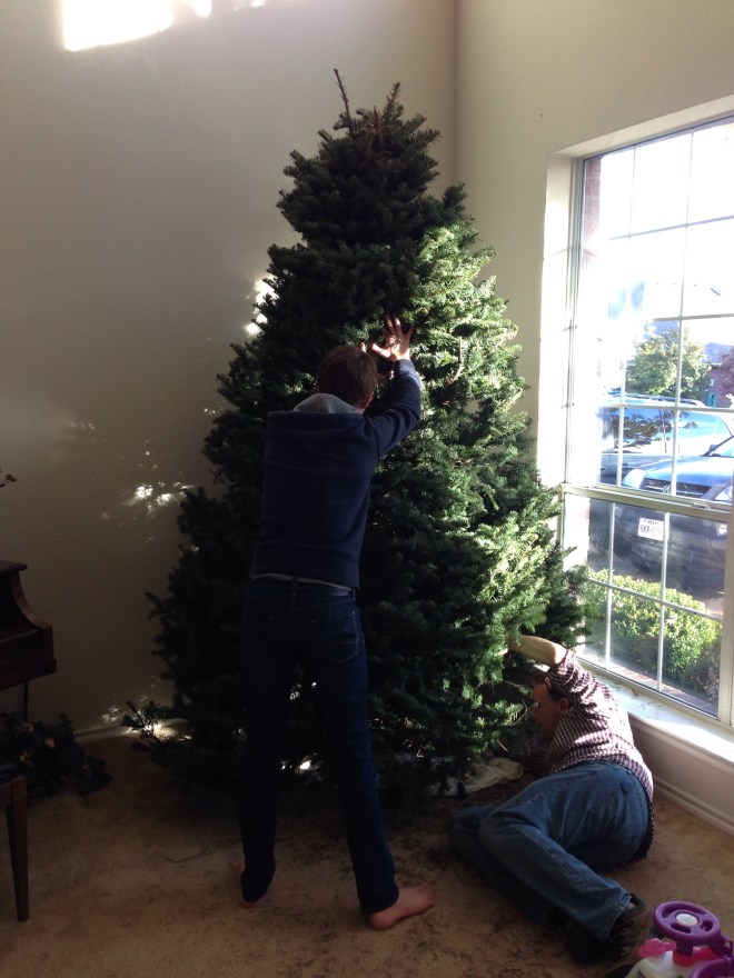 We found a beautiful 9′ Frasier Fir at Home Depot. Since we didn’t cut it down at the tree farm, I made the boys saw off the bottom branches and fresh cut the trunk. Close enough to the real thing. π