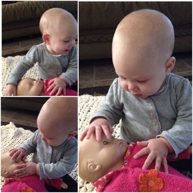 Nothing is cuter than a little girl and her baby doll. Today, Lucy discovered Natalie’s Lilly doll sitting on the shelf in their closet. She was so excited seeing it, I had to get it down and show her. Lucy was in love!
