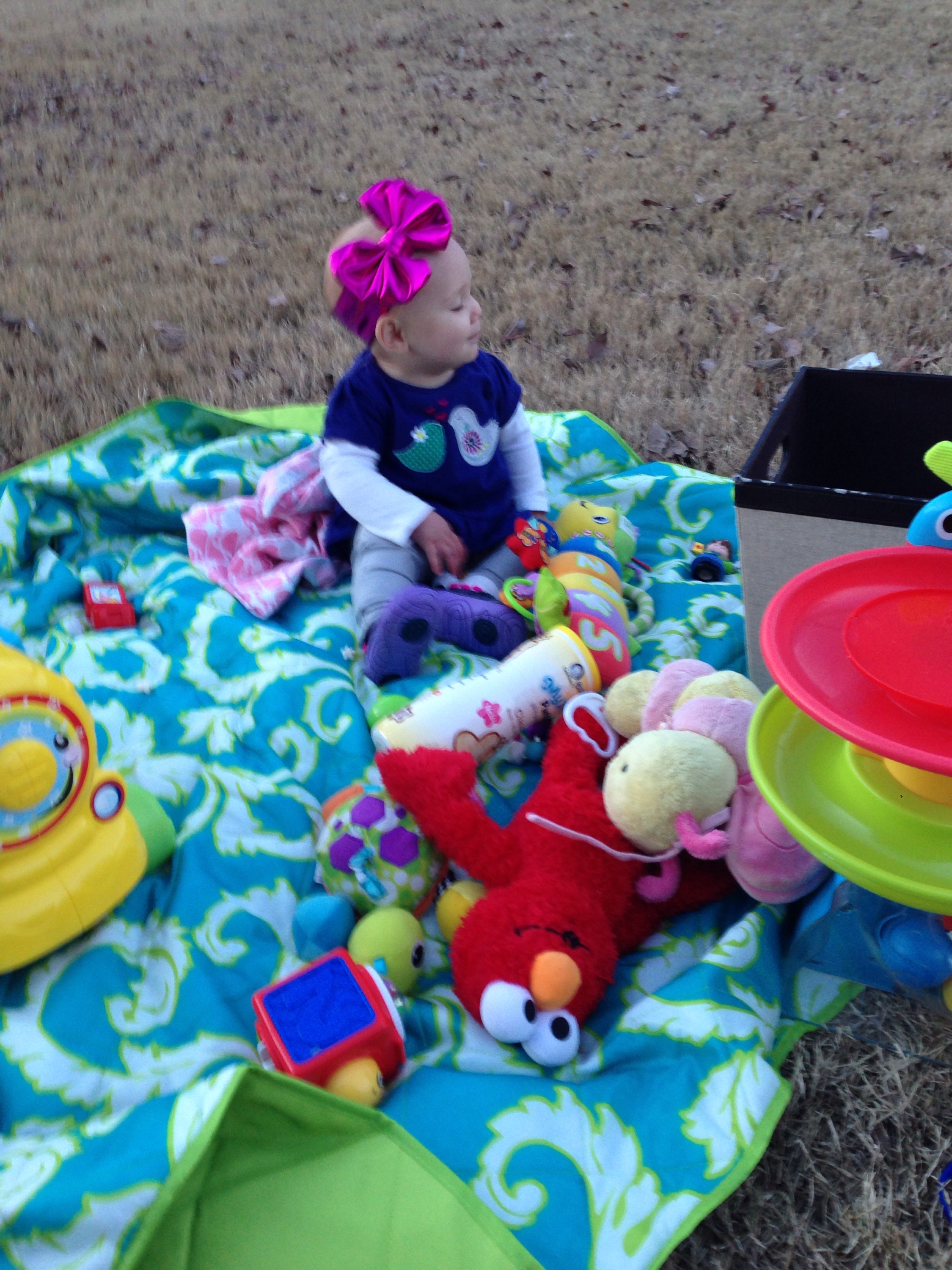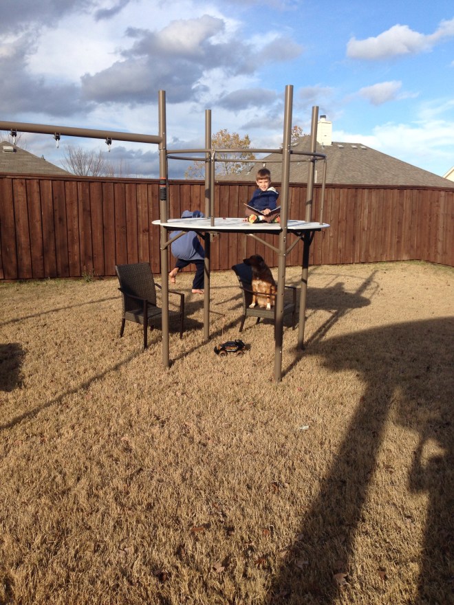 It was so pretty, we sat outside. When all the kids came outside for lunch recess, Lucy insisted on being put down to walk. She wanted to take off with the school kids. If I tried to pick her up so we could move a bit faster, she would scream. Silly girl! I don’t think she even realizes, or cares, that she is 1/5 their size. After lunch, we came home to work on our fort. Lucy has been such trooper! She will usually play on her play blanket for about an hour before she needs me. It has been such a huge help to try and get this thing finished!