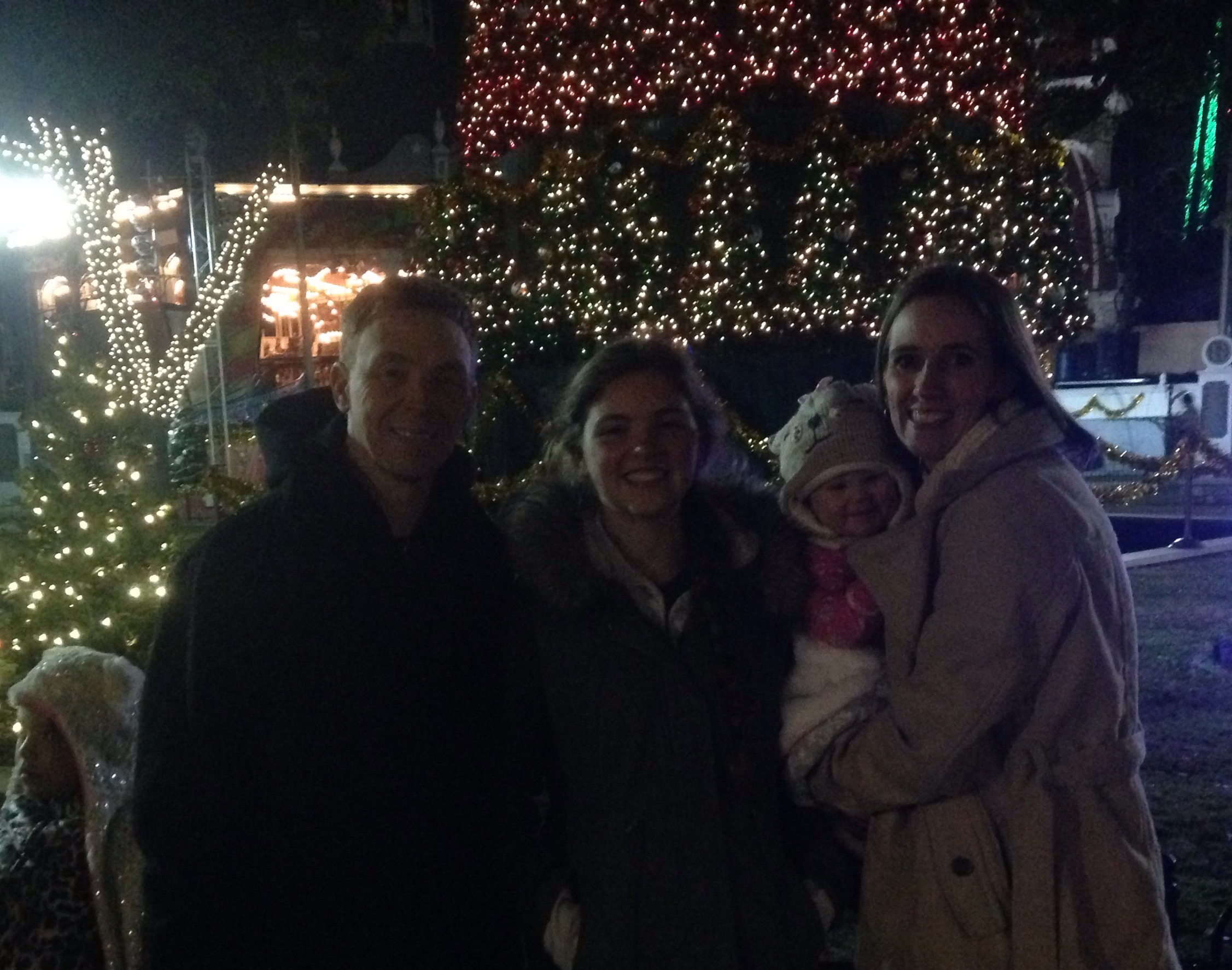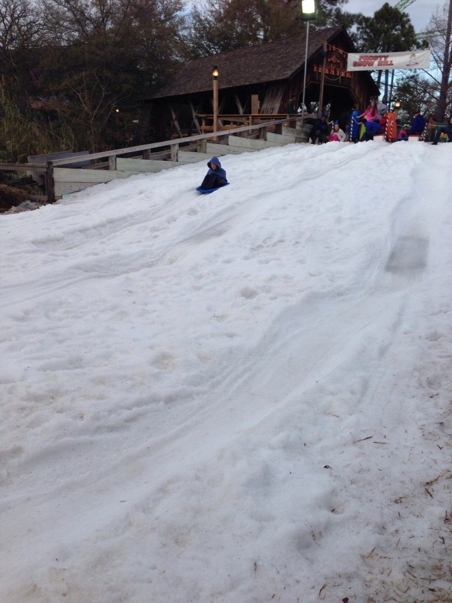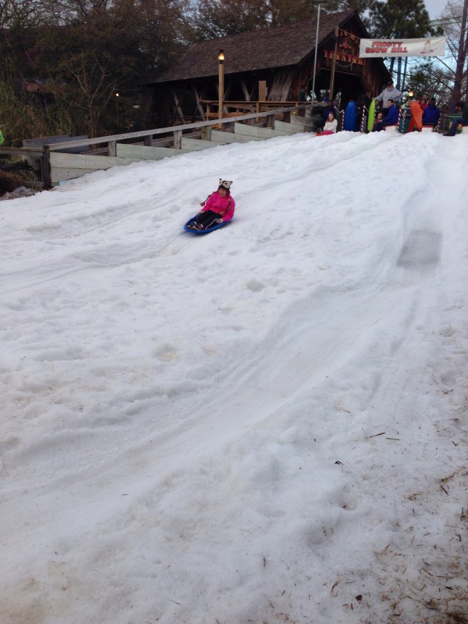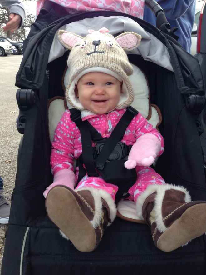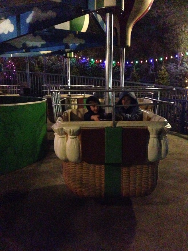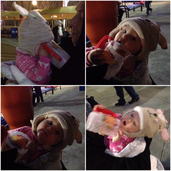 Today was Brie and Dallas’ last day here before heading back to Utah. We wanted to do something fun, so we thought we would try out Holiday in the Park at Six Flags. I was a little nervous since it has been fairly cold the past few days. Now that Lucy is feeling better, I didn’t want to be the cause of her getting sick again. We bundled her up in multiple layers.