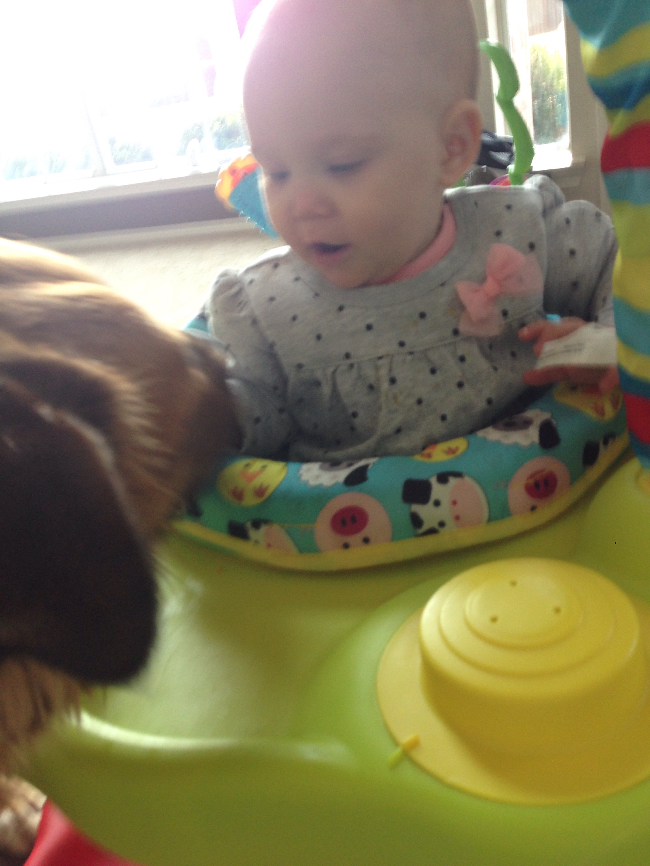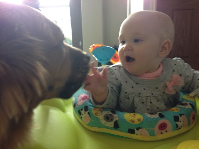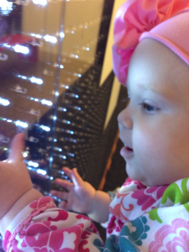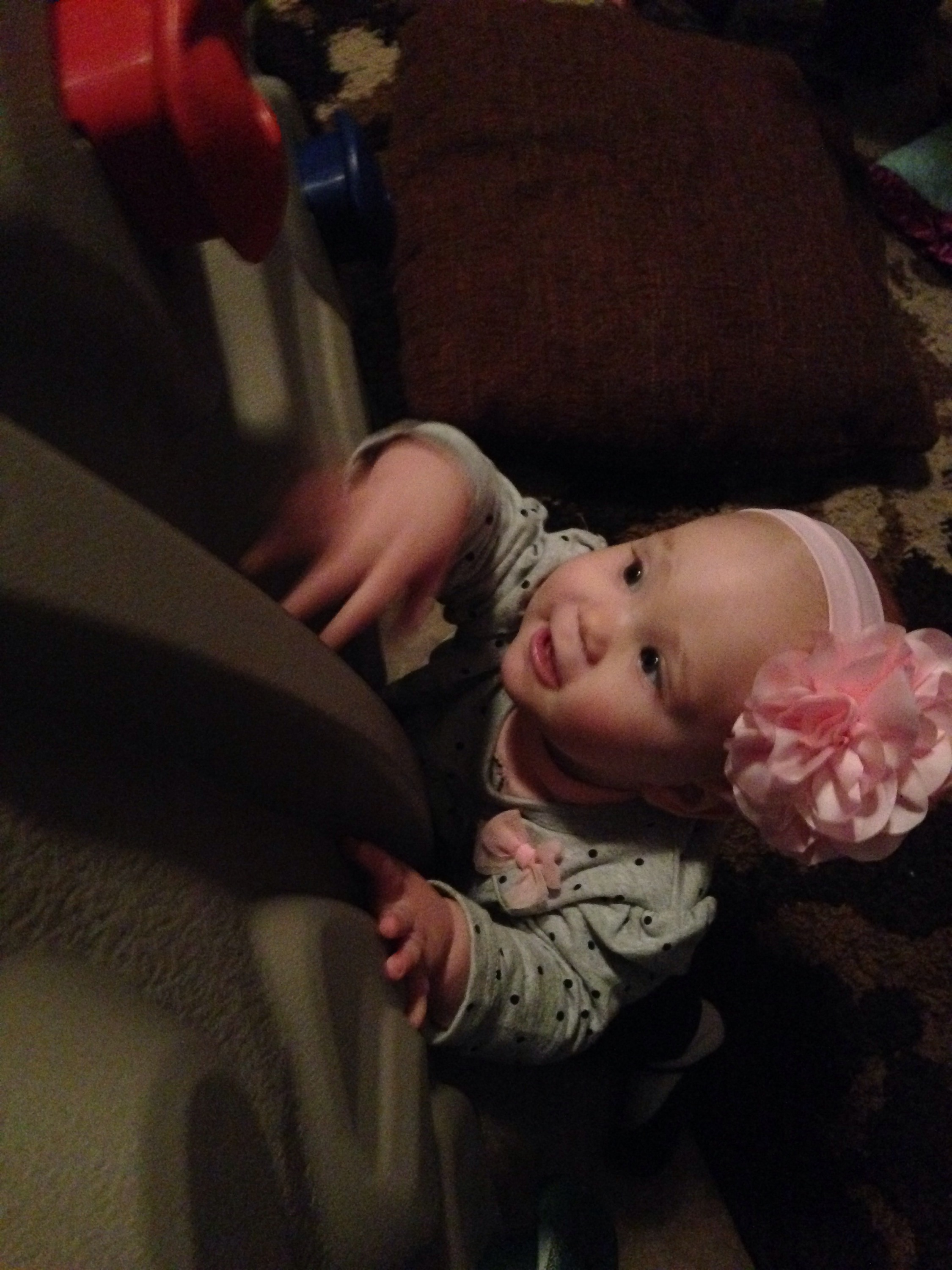 WOW! It seems like the last 2months have flown by so fast. Lucy has grown and matured so much. Her awareness of her surroundings is incredible. She doesn’t forget at thing! I have to remember if I go to the fridge with her now that she knows the whipped cream is in the door, and when it opens, she can grab it. It isn’t like she knows the goodness inside the container, but it must be the best container ever. π Lucy is really finding her independence too. She wants to do things HER way! When we walk to the bus stop each day, she wants to get down to walk when we get there. All is fine if she has shoes on, but shame on Mommy if I brought her only in socks and she can’t get down. Lucy will get very mad. She now prefers to stand to play. If I set her down on the floor, she will work her way to something to pull up on. Today, I put her down by her table and went to enter some things into the computer. No sooner do I sit down a few feet away from Lu, she has already tried to stand up against her table, lost her footing, and wiped out, scraping her forehead on the edge of the table on the way down. She sure has BIG plans. “Don’t mess with me standing, Mom! I’ve got this!”