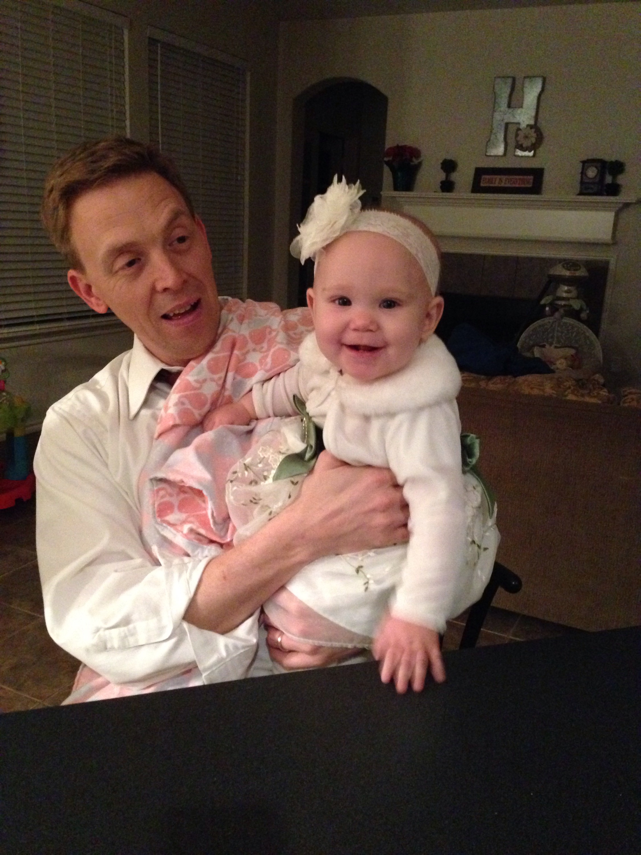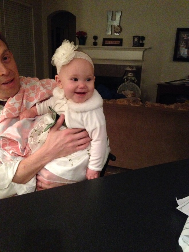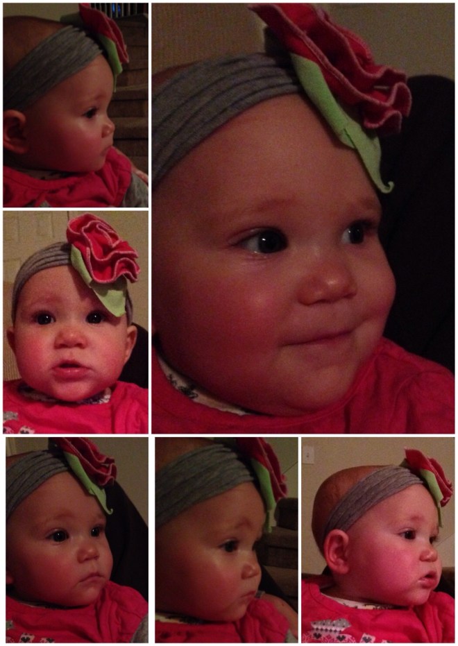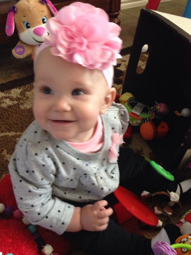 She is so silly. Lucy loves to make faces to get a reaction. She likes to growl now too, especially when I squeeze her, or when she wants attention. She still loves to smile at people when they acknowledge her, but has not gotten past her separation anxiety. We have been dealing with this since she was 3 months old. She is great with Daddy now, though, which is a huge improvement. It is so much nicer to walk around the house when Sam has her, without having to feel like I need to duck and hide to not be seen. Here are her 8 Month Tidbits: Weighs ? Is ?” Tall, Has 2 Teeth, Likes Mommy, Daddy, her Gigi Bunny, Storytime & Swim, to play peekaboo, bathtime, to eat paper, find all the fuzz and leaves in the carpet, & to be with the big kids. She Dislikes: Babyfood!, being put on her tummy, being taken away from Mommy. She still LOVES Piano Guys and her Smart Baby CD. Lucy can say “Mama”, “Dada”, “Bubba”, “Up”, and most recently “Hi.” Her only baby sign at this point is “Eat.” Happy 8 Month Birthday Lu! I love you so much! Please stop growing up so fast! You will never be a baby again. π©