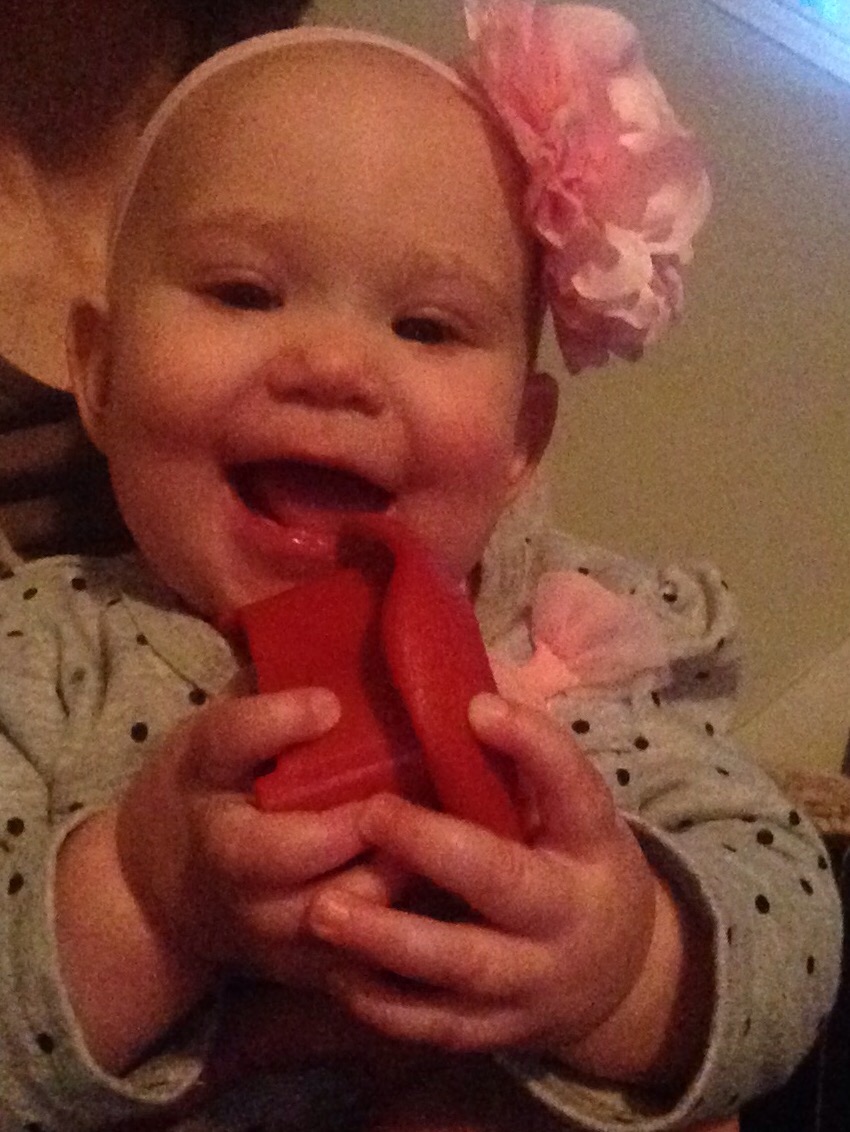 Lucy ate 2 entire Mum Mums today! Usually she bites them, and then just lets them sit in her mouth. We also realized that she likes her food pouch food cold. She actually swallowed half a pouch of her carrots and apples today! This was probably the most she has ever swallowed at a meal. Now if she will just quit sharing with the dog. π