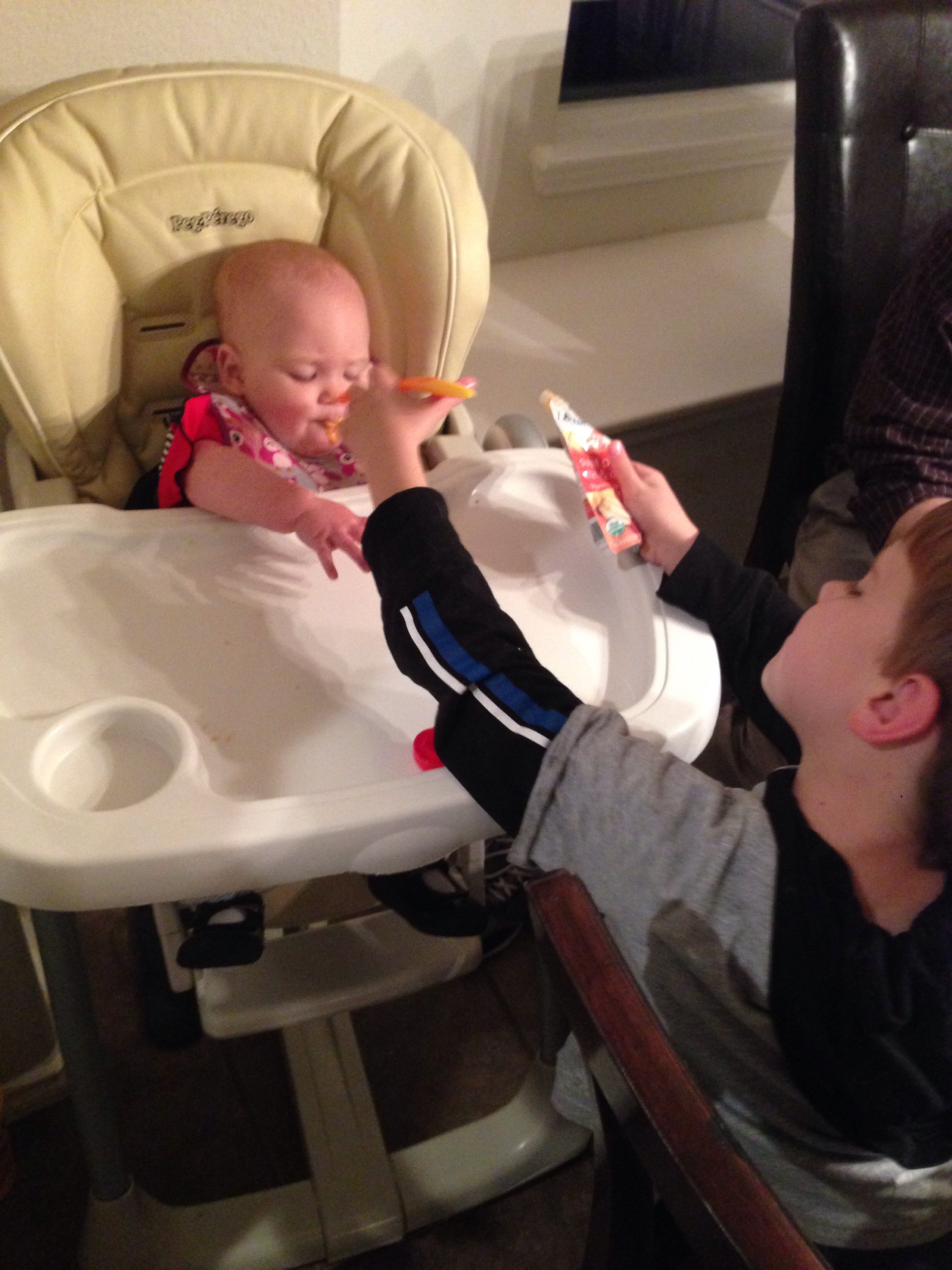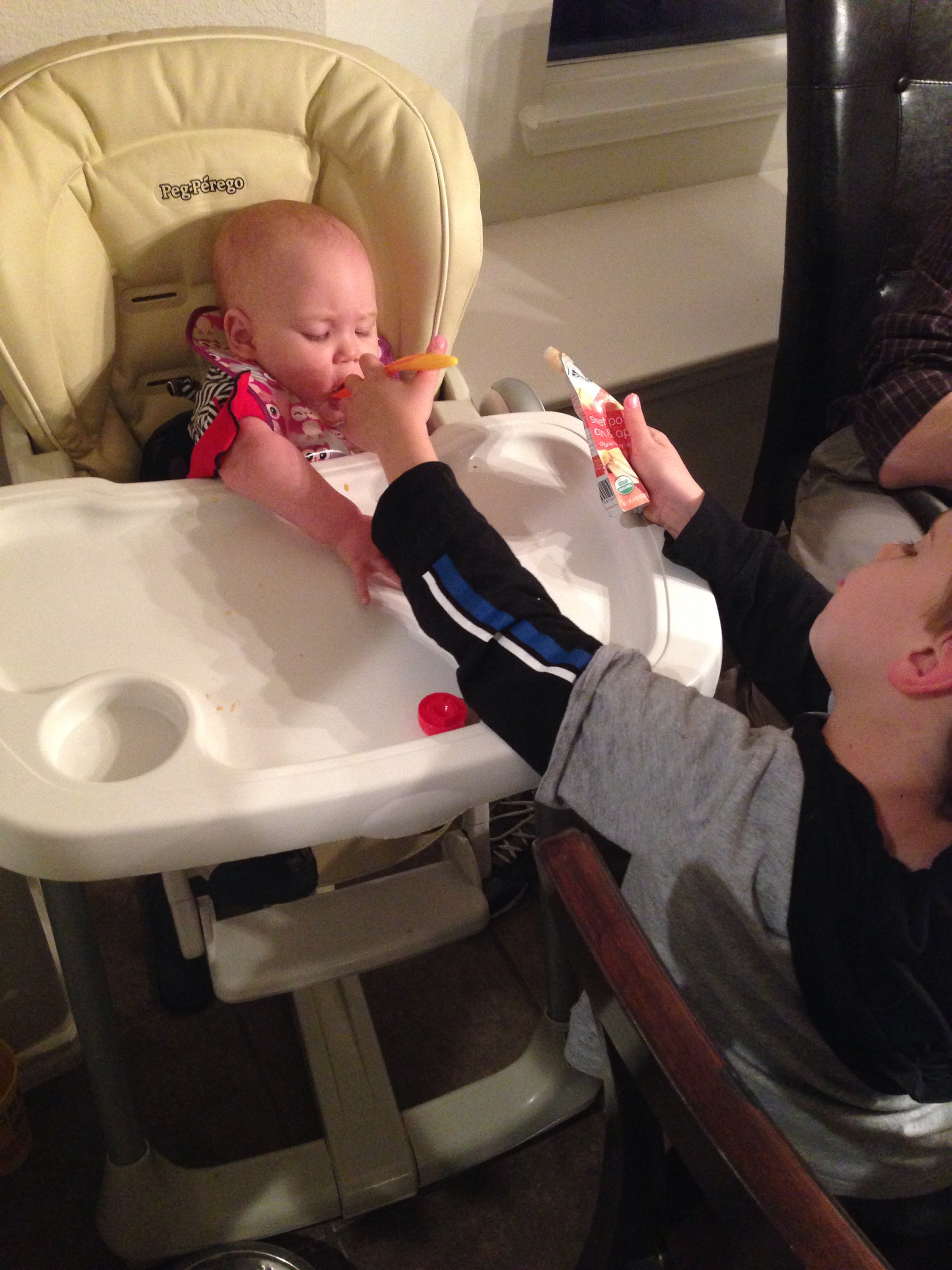 At least she lets Alex feed her. π He is such a good helper!