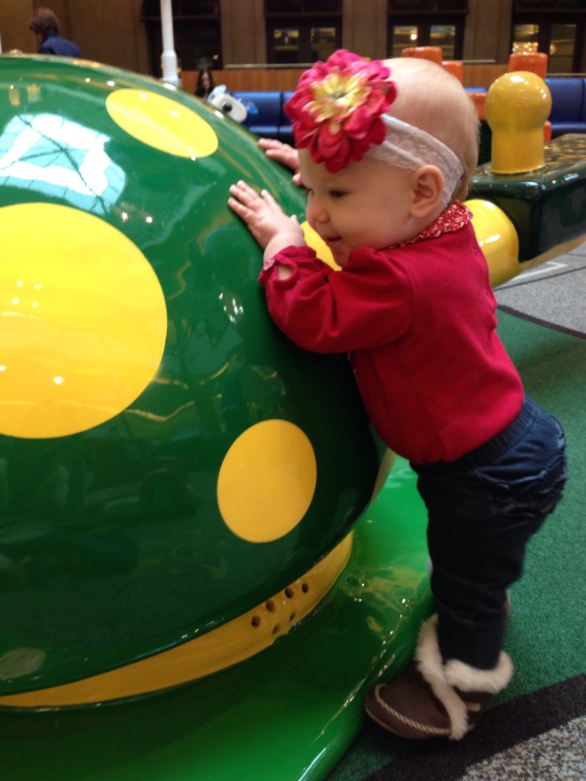 I took Lucy to the mall for a good walk and play place workout today. It was cold and rainy outside, and I was not wanting to just stay in the house. Lucy had a blast in the play area. She kept waving to people and saying “Hi.” She actually followed around a sweet little 14 month old girl for a while. I guess Lucy thought she was her buddy. π