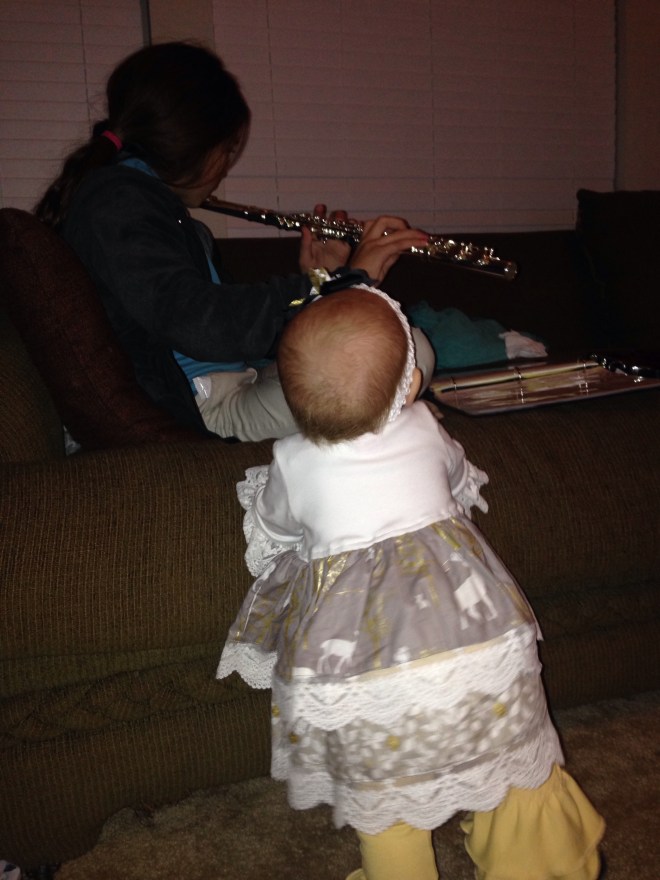 Brianna won a Britax BSafe infant car seat. We were so excited for her because she really needed one. Her baby girl is due in April. We ate dinner and enjoyed chatting with other moms. It was GREAT!π Lucy was great too! Sam is out of town right now, so Lu had to tag along. I couldn’t ask for a better baby fir going out! I hope she stays this way. When we got home, Lu had to catch up on sibling time. She loves when Natalie plays music. Tonight, it was her flute.