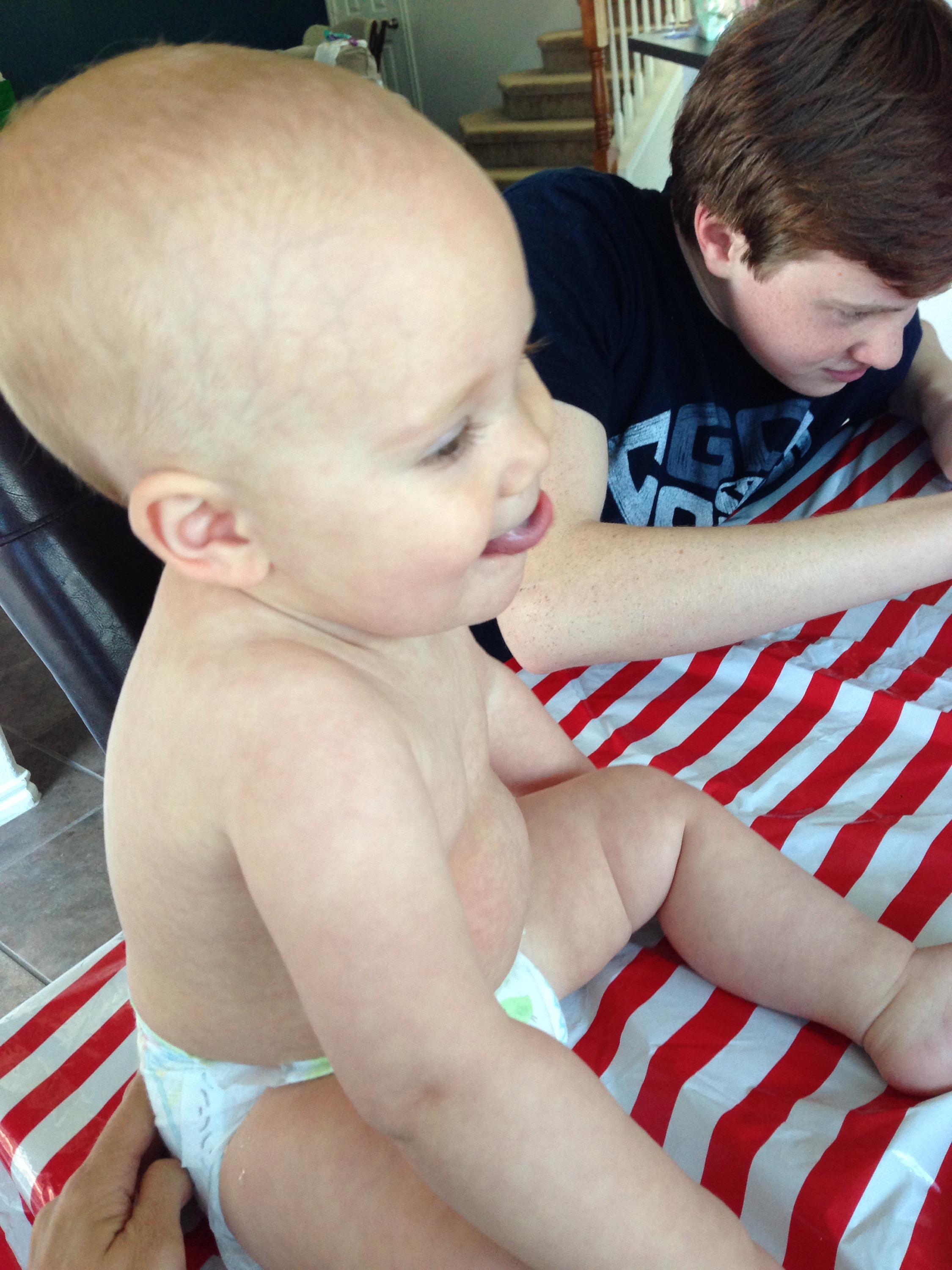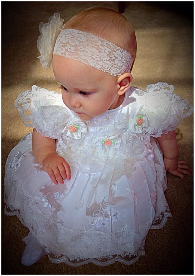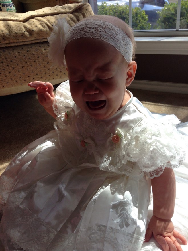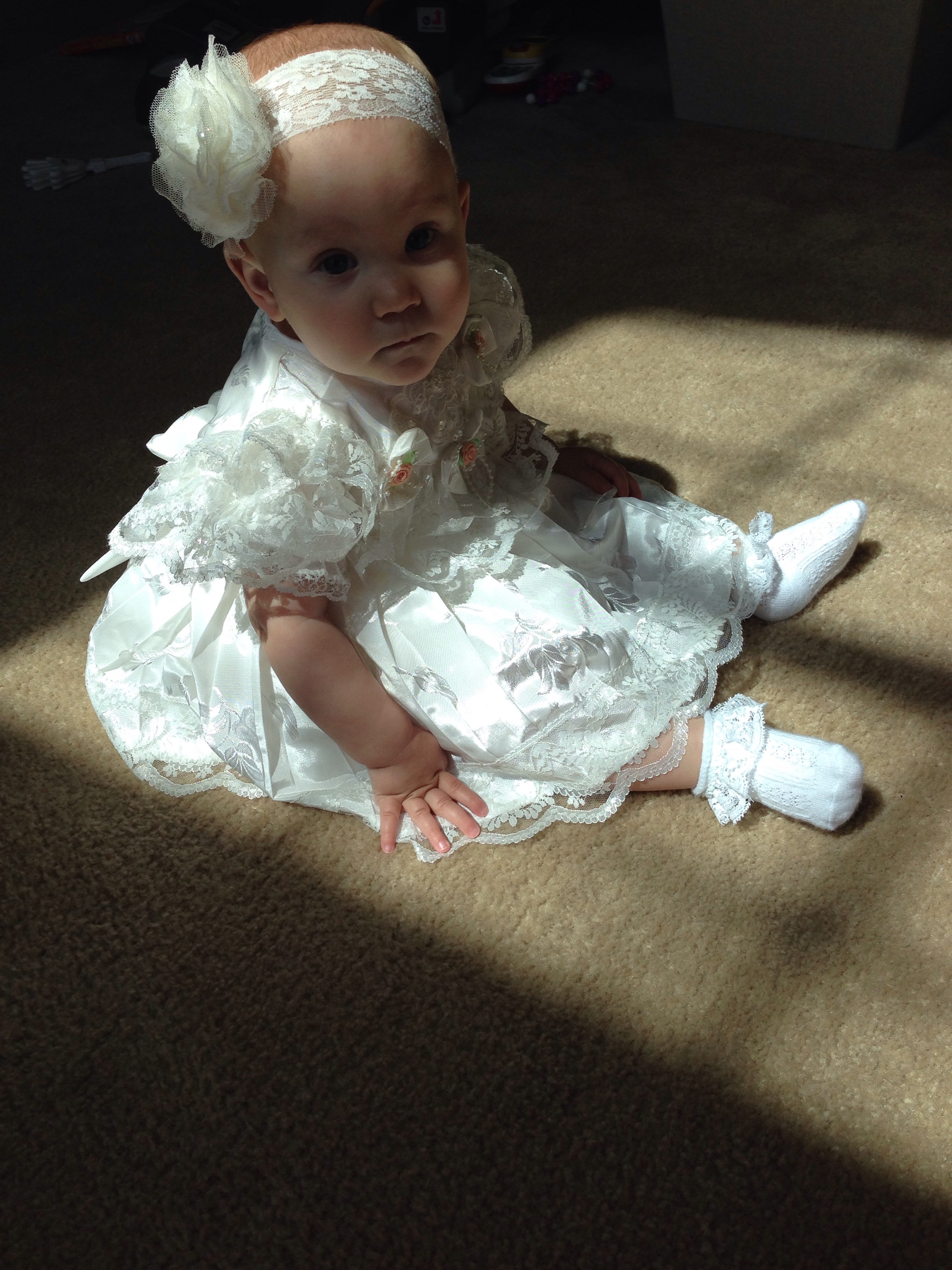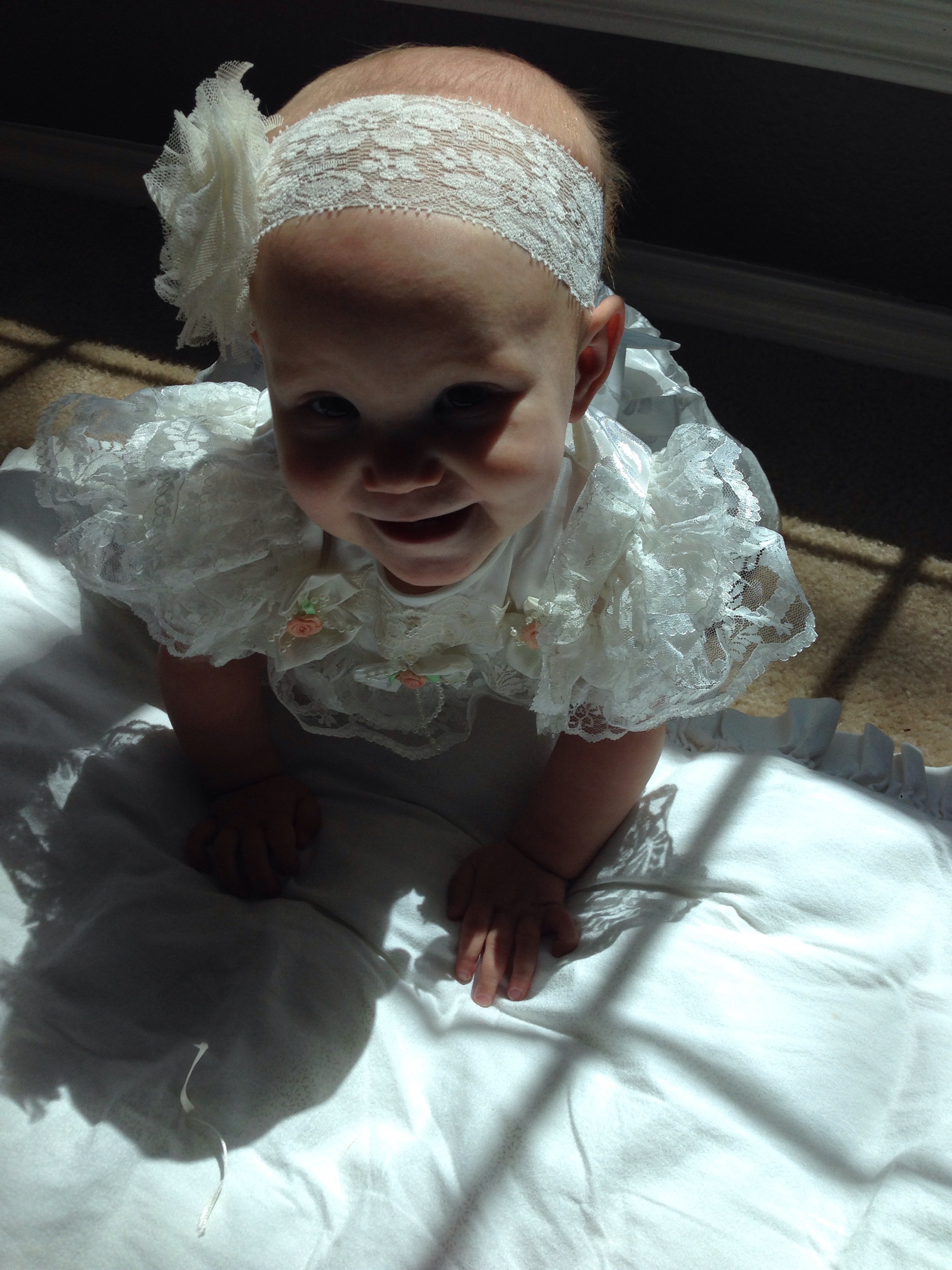 This is such a special dress because it was Brianna’s Easter dress when she was a baby. Yesterday, I would have said the dress was ruined because Natalie had it on one of her dolls. It was horribly stained and discolored. Hooray for Oxy! It came clean beautifully and looks brand new. I managed to get one smile…