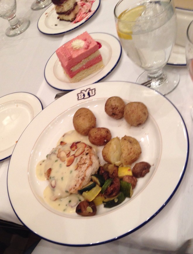 We got to eat dinner on BYU’s official china. We had salad, rolls, chicken with an almond sauce, roasted potatoes and veggies, and the most heavenly strawberry cake with white chocolate crusted bottom. Yum!