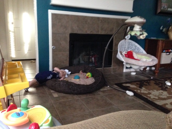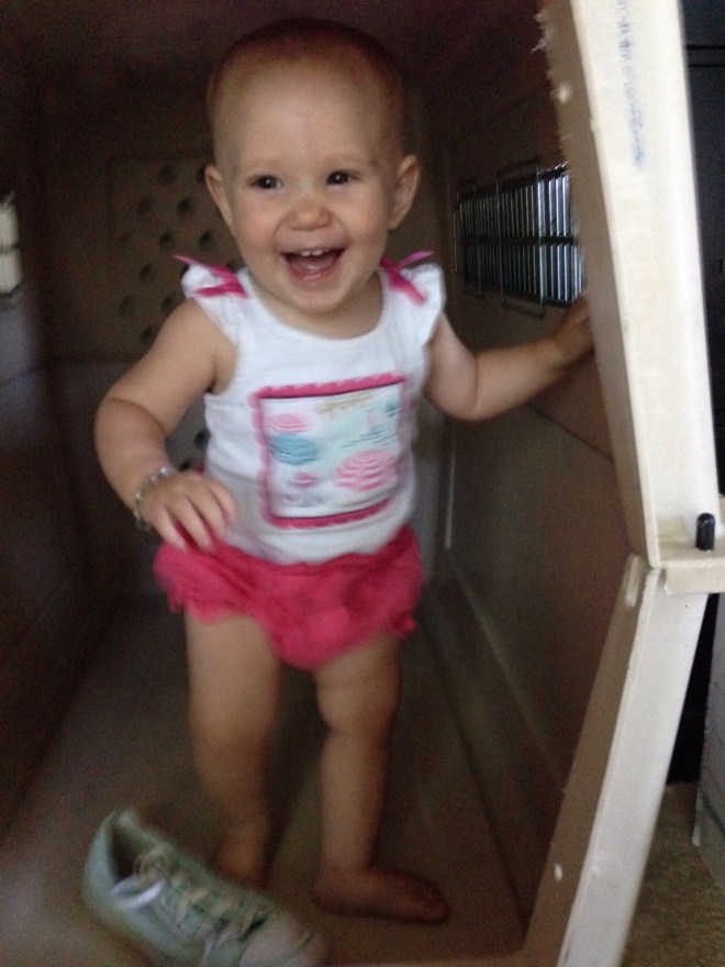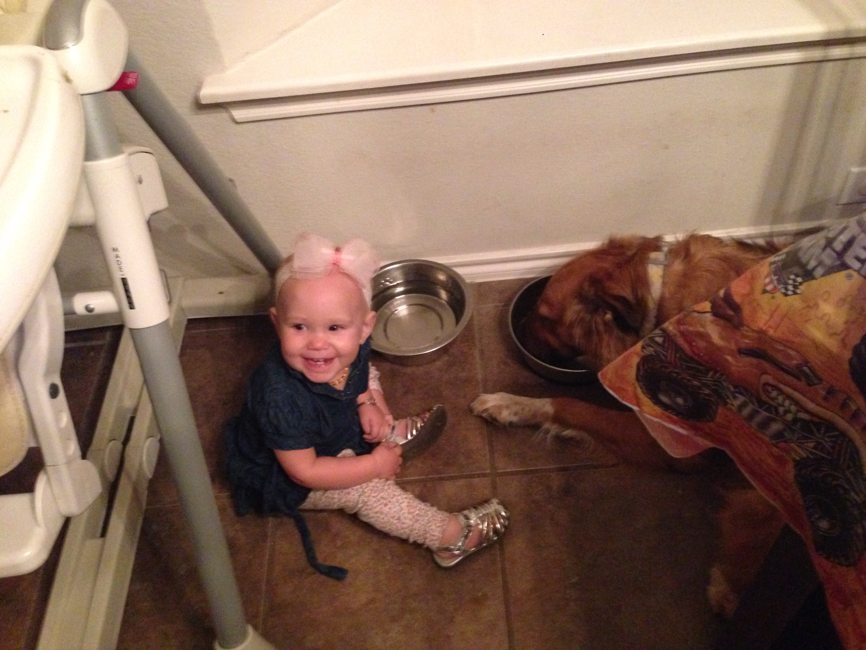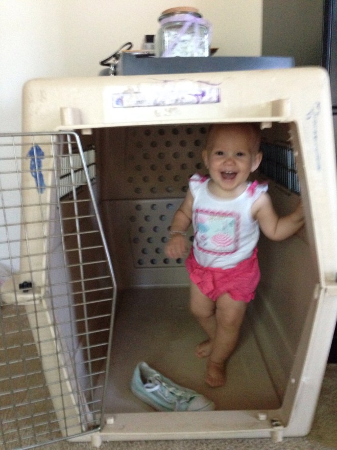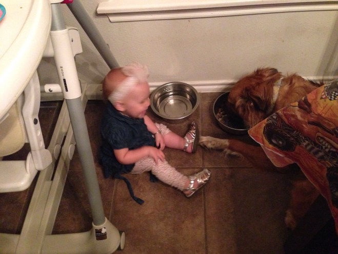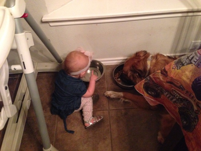 Life with a Dog and a Baby Jun 15, 2016 Yes our baby sleeps in a dog bed, eats dog food and “treats”, and locks herself in a dog crate! We are a happy dog owning baby havin’ family! And wouldn’t have it any other way.