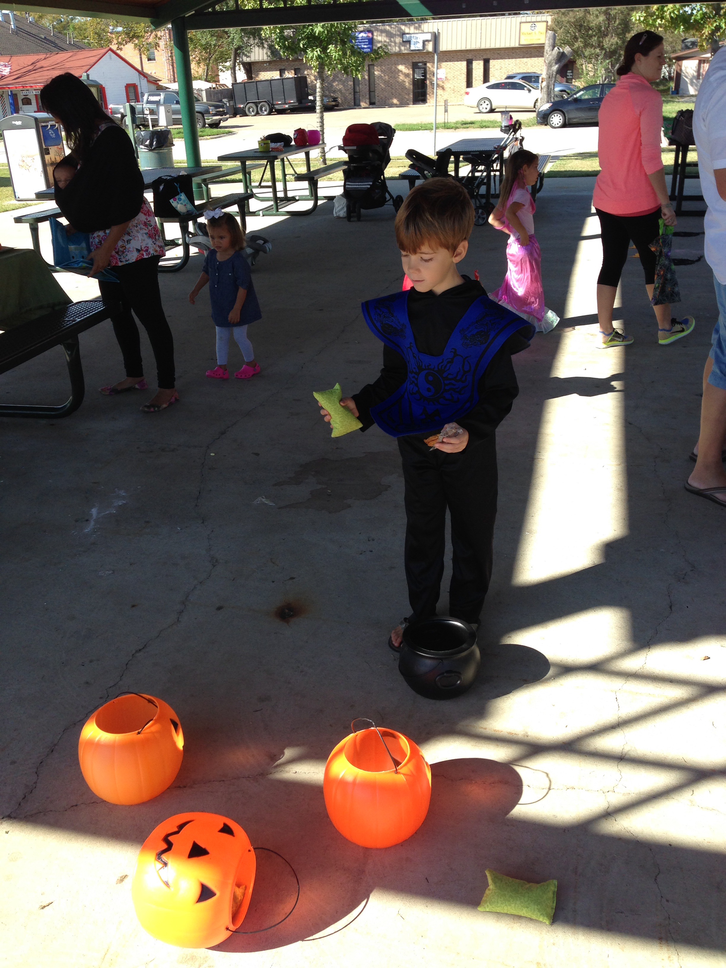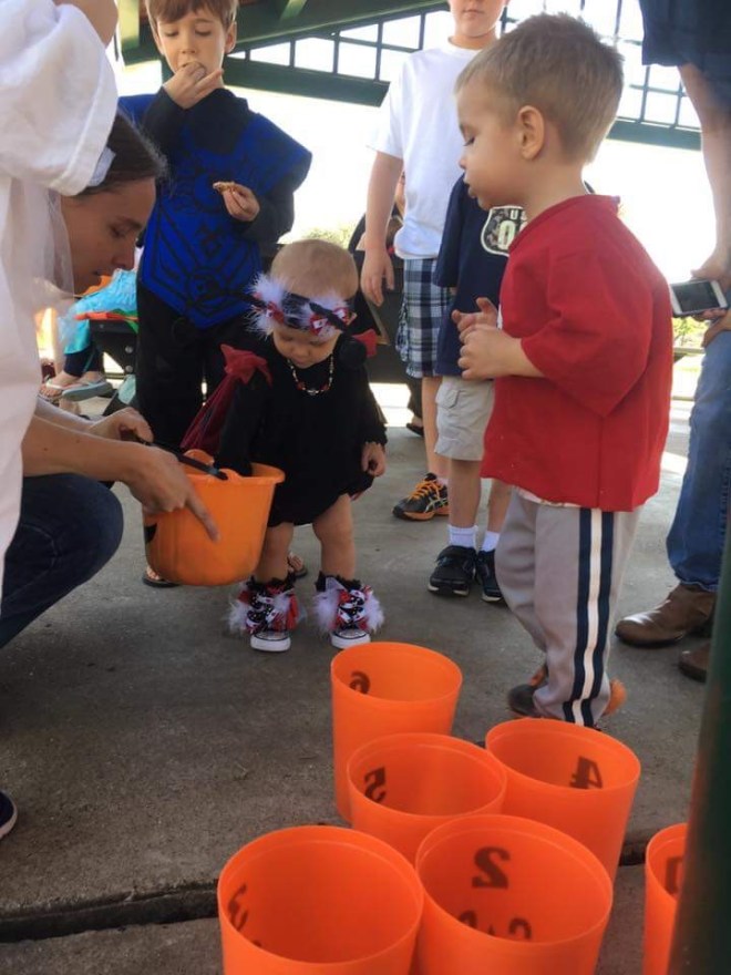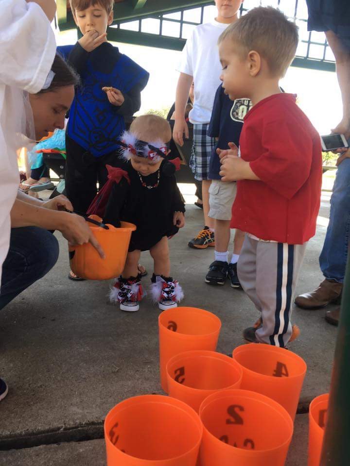 They had a ping pong toss, bean bag pumpkin toss, spooky coloring, cupcake walk, guess the candies, Halloween bingo, mummy bowling, and a candy swap.