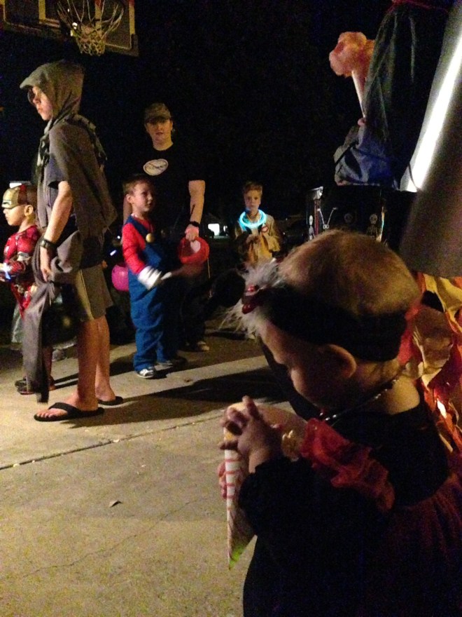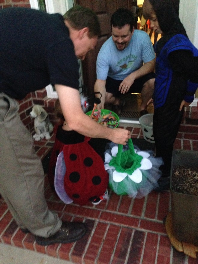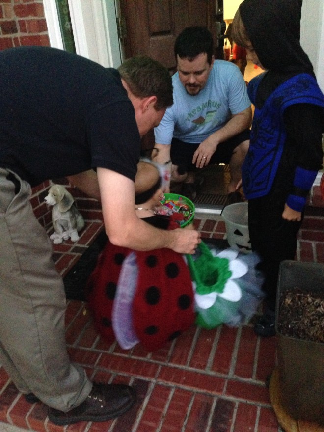 Lucy caught on to the whole trick-or-treating thing super fast. The boys were great helpers too. They realized you get lots more candy with a cute baby sister. Sam and I thought it was crazy that we are usually embarrasssed to take pictures of our kids trick or treating at peoples’ homes, yet this year, they were taking pictures of us. Crazy the way the world has changed with technology.