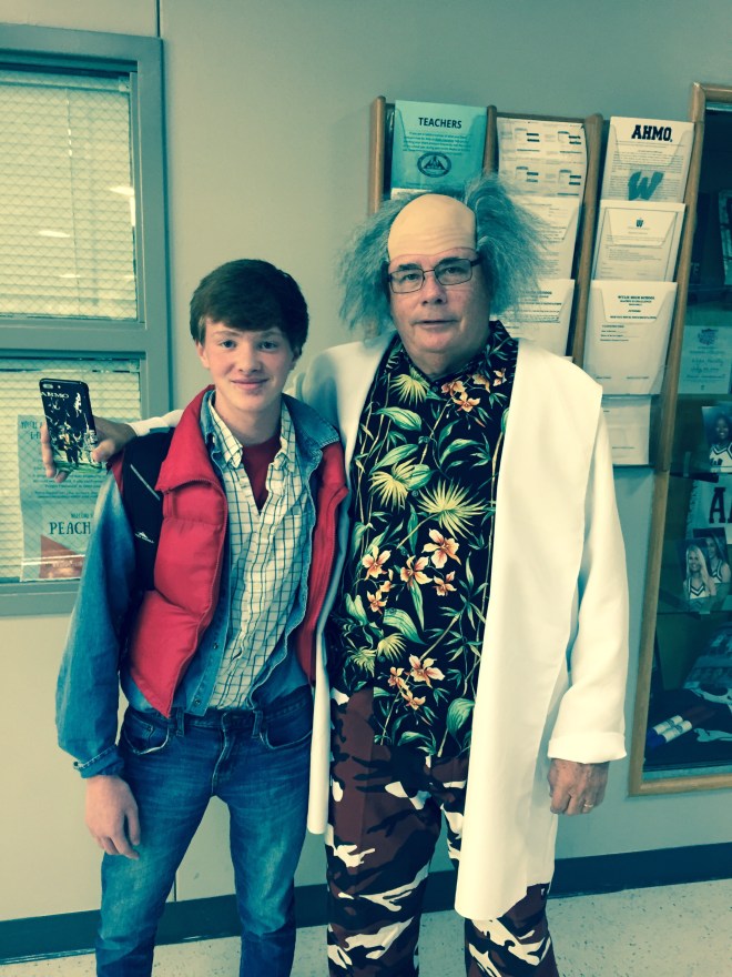 Nate dressed up like Marty McFly and was surprised to see his principal was Doc Brown.