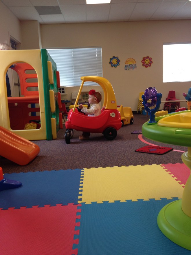 We are making progress in Lucy’s advancement into nursery. Today, she even allowed Sister Coon to take her to get a drink at the water fountain and also let her watch Wiggles with her. It was so cute! After our class was over, she actually asked to go slide in the nursery. She went right in and played and interacted with the kids instead of clinging to me. She found the “Big Red Car” and didn’t want to leave.