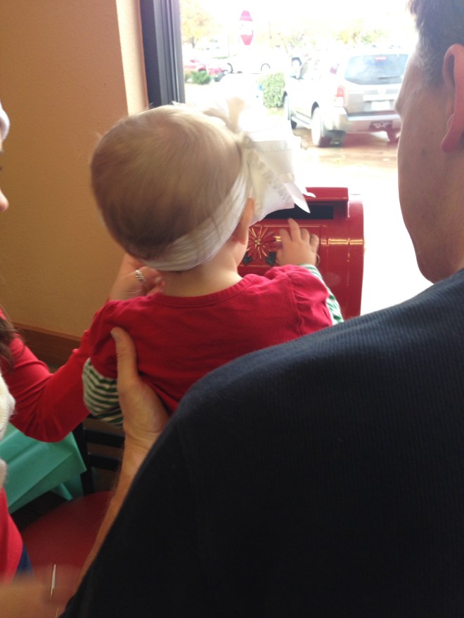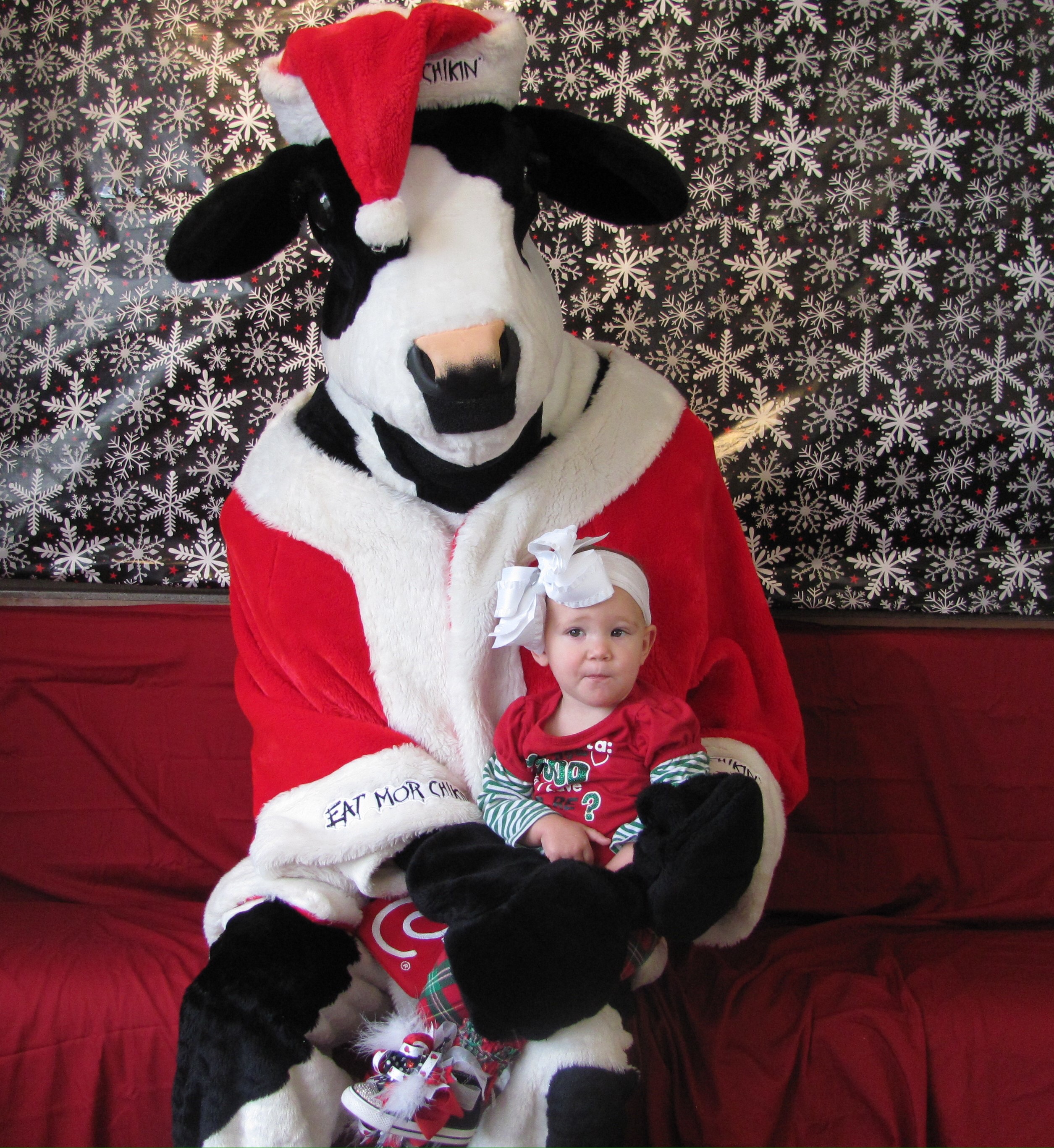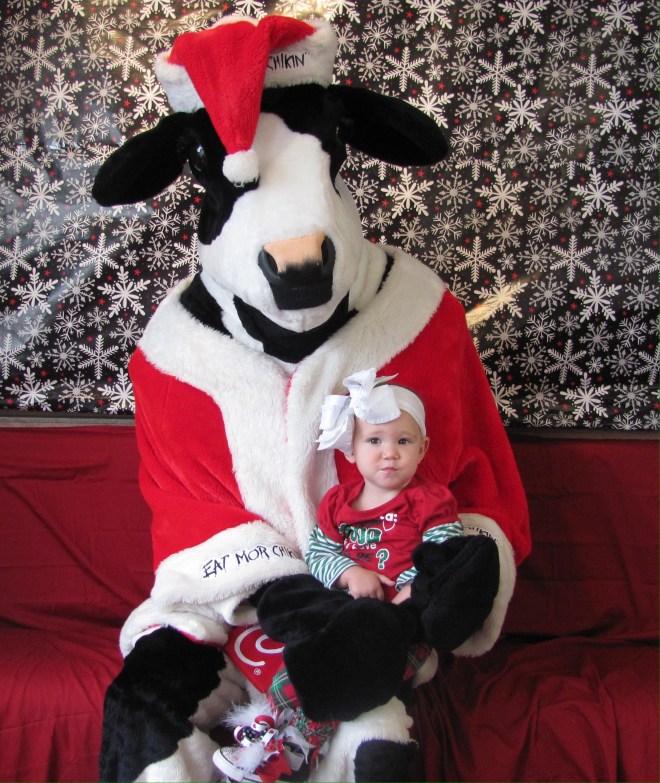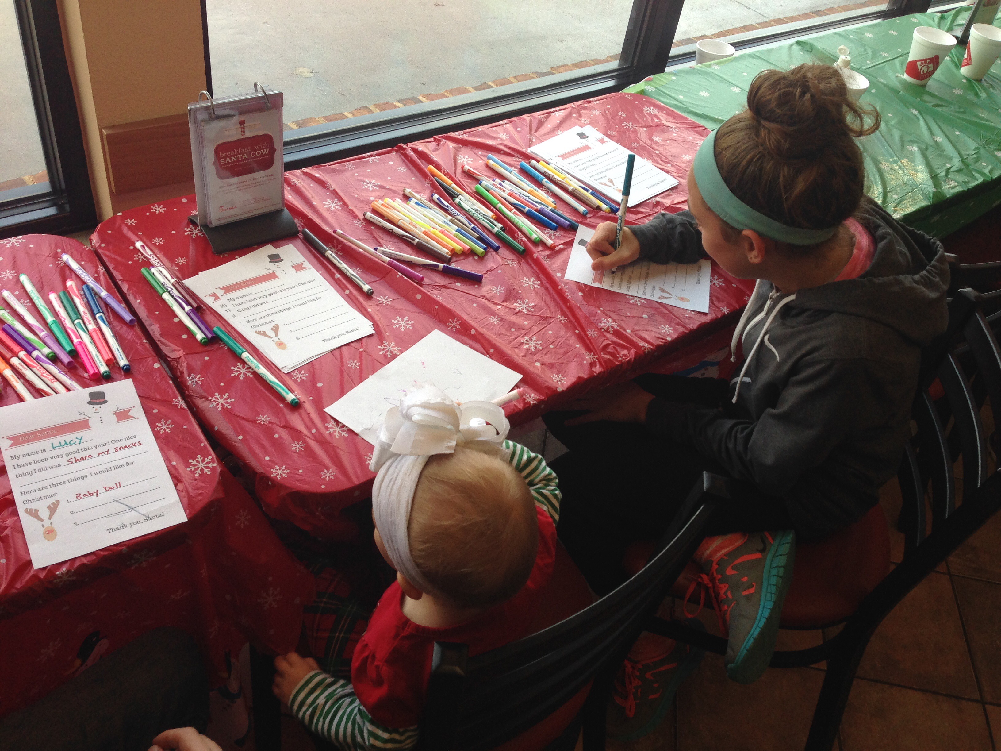 Lucy LOVED the Cow, but when it was her turn for her picture, she had a mouth full of chicken nugget. Oh well. π The kids wrote letters to Santa,