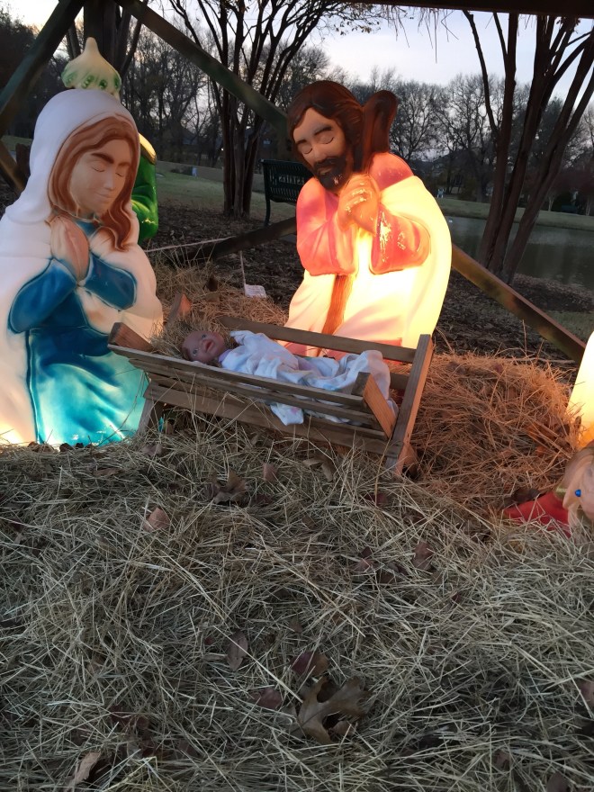 Then, she realized Lilly was in her car. She got her out and told me that Lilly still needed to go and see baby Jesus. She took her over there and told her all about Jesus. She showed her the wisemen, Mary, & Joseph. Then, she let Lilly “touch” them all. Then we were good to go. Such an incredible little experience.