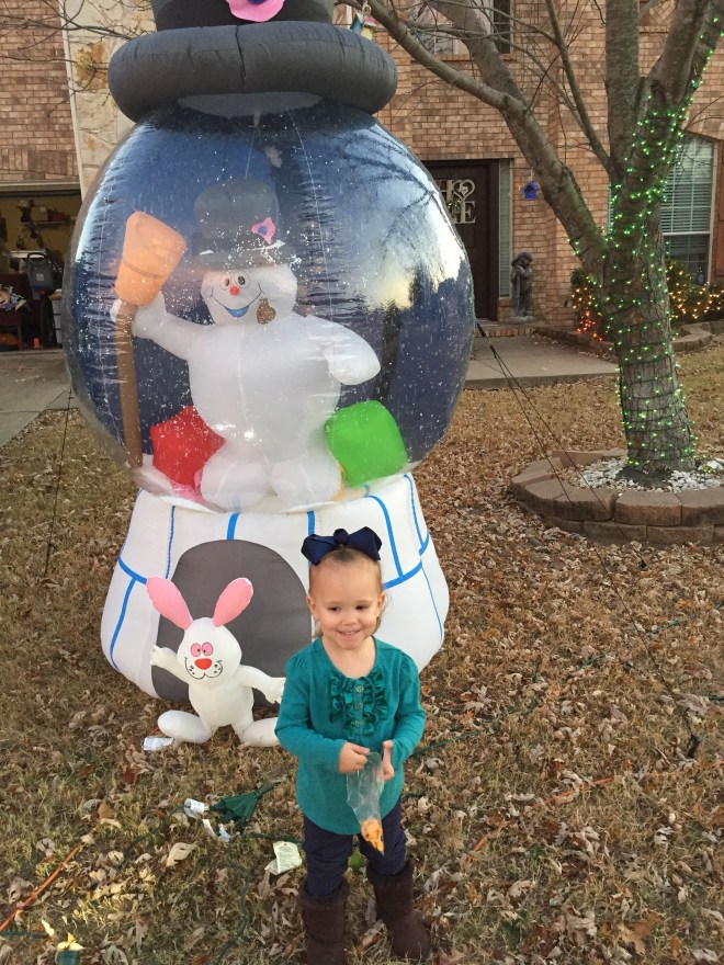 As we were leaving, we walked by the neighborhood’s nativity display. Lucy liked it last year, but this year it was brought to a whole new level. She wouldn’t leave! She kept wanting to go into the manger to sit with the baby Jesus. I was super embarrassed at first because it was rush hour and a million cars kept driving past us. I didn’t want anyone to think she was vandalizing the decorations. Finally I just got over it and let her enjoy the beauty of the scene. She gave baby Jesus pieces of straw. “A special gift for Jesus because he is so cute,” she told me.
