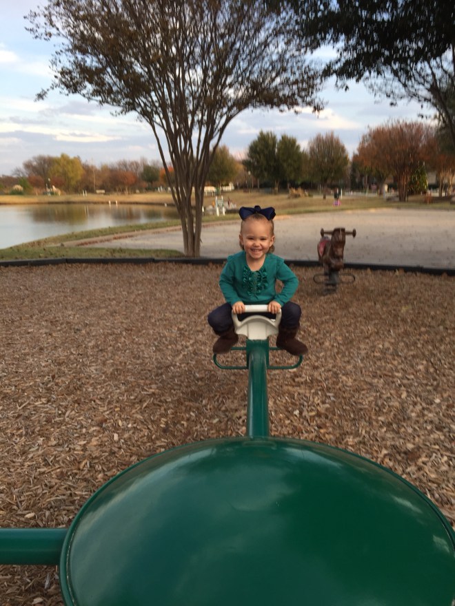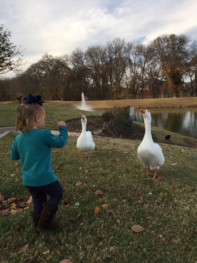 She fed the ducks until all our bread was gone, talked to the squirrels, and played on the playground.