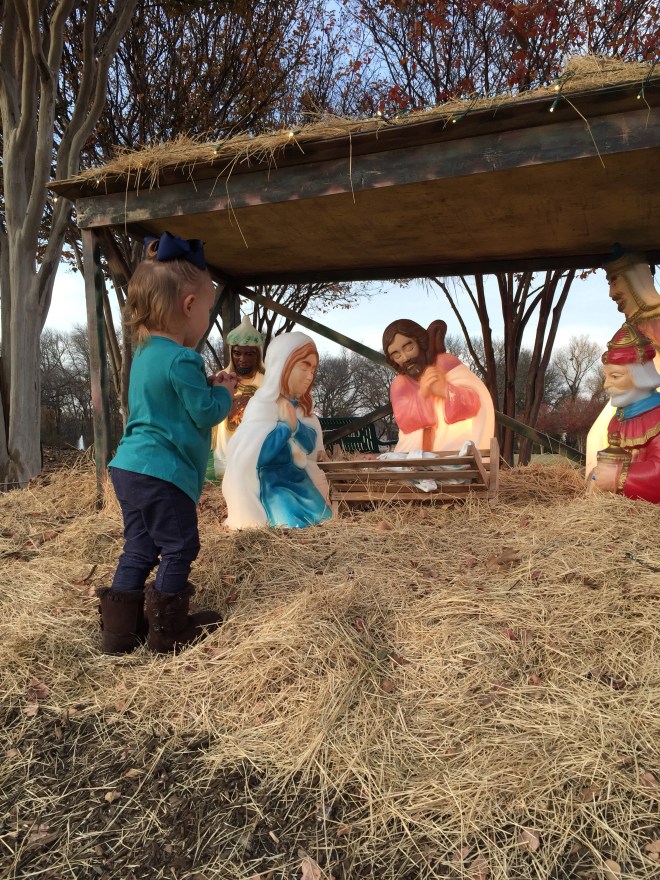 As we were leaving, we walked by the neighborhood’s nativity display. Lucy liked it last year, but this year it was brought to a whole new level. She wouldn’t leave! She kept wanting to go into the manger to sit with the baby Jesus. I was super embarrassed at first because it was rush hour and a million cars kept driving past us. I didn’t want anyone to think she was vandalizing the decorations. Finally I just got over it and let her enjoy the beauty of the scene. She gave baby Jesus pieces of straw. “A special gift for Jesus because he is so cute,” she told me.