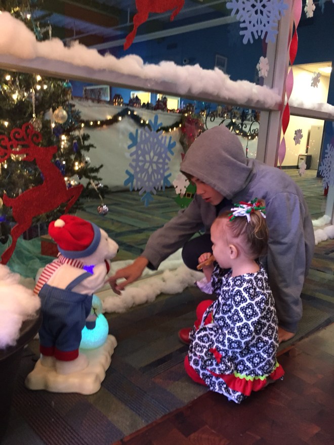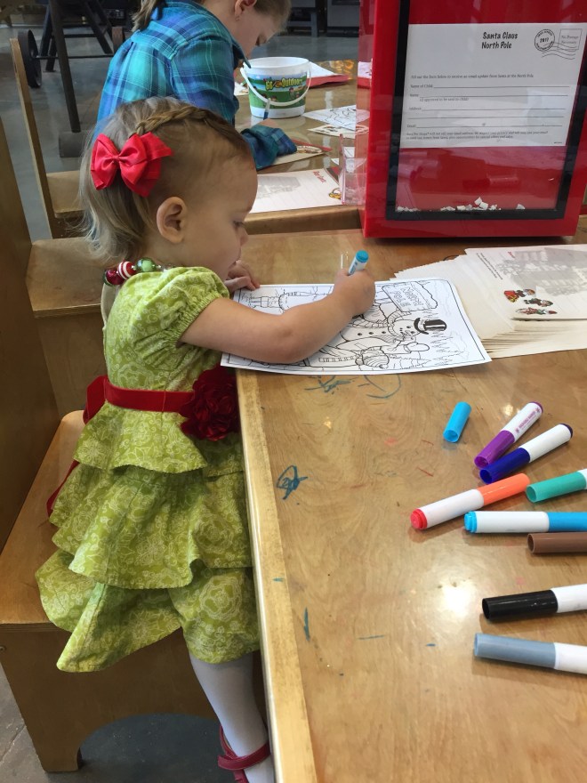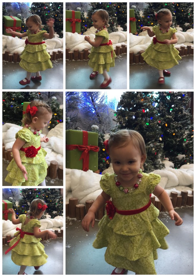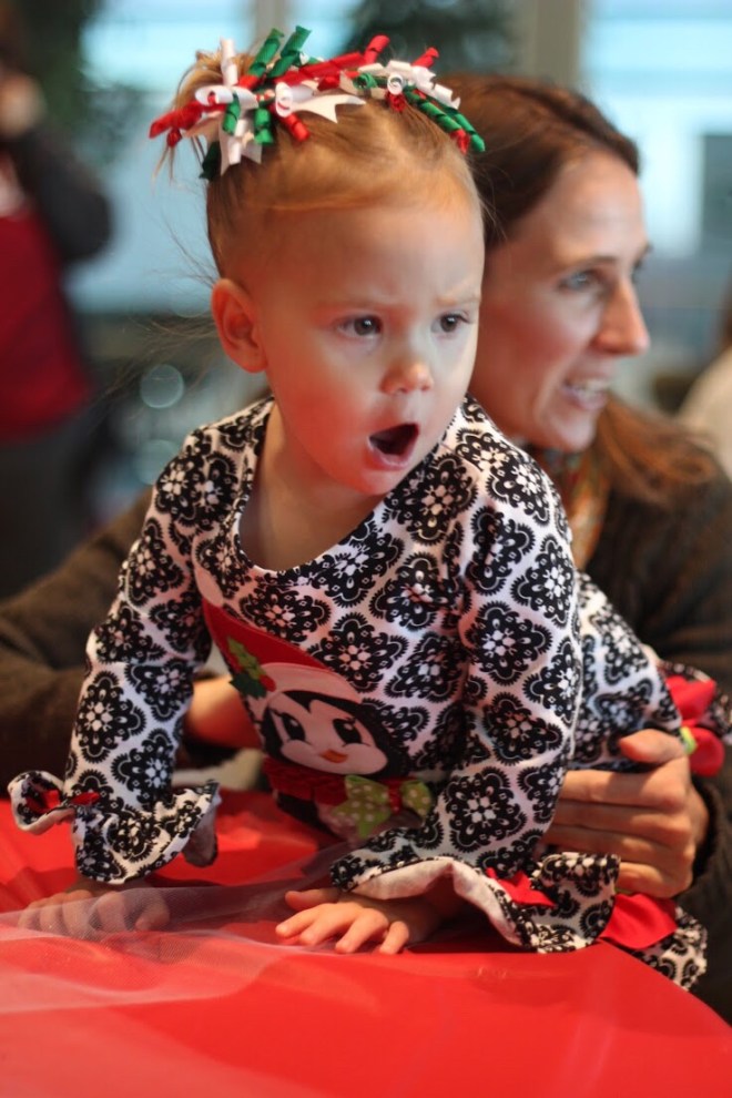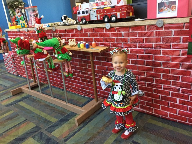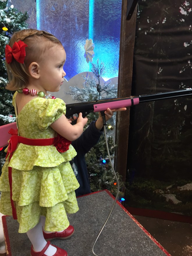 Afterwards, we did a quick change and headed over to Bass Pro Shop to try and get her pictures taken with Santa. Crazy idea! It was SO crowded! We waited in line for 20 minutes, and only 2 kids saw Santa in that time. We would have been there all day with the 30+ people ahead of us still needing to go first.