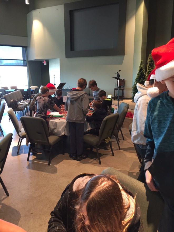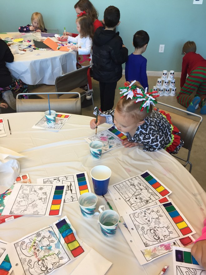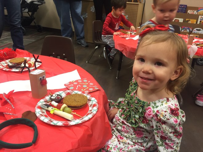 The class had reindeer juice, reindeer brownies, Grinch Claus Fruit skewers, and oatmeal cream pies. It was perfect since they had just eaten lunch 45minutes before the party, and had their chocolate milk bar at the Polar Express earlier in the morning.