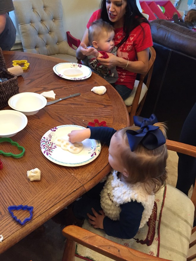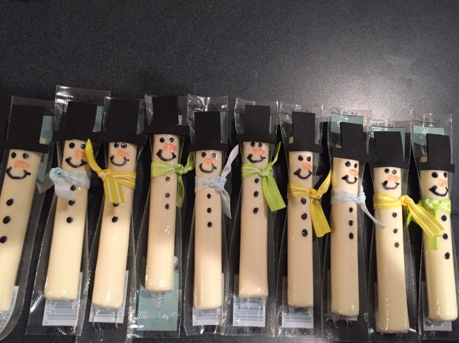 We made snowmen cheesesticks this go round. It seems like snowmen are our theme this Christmas.
