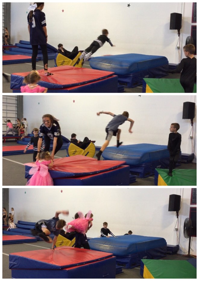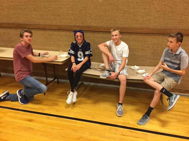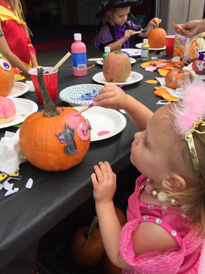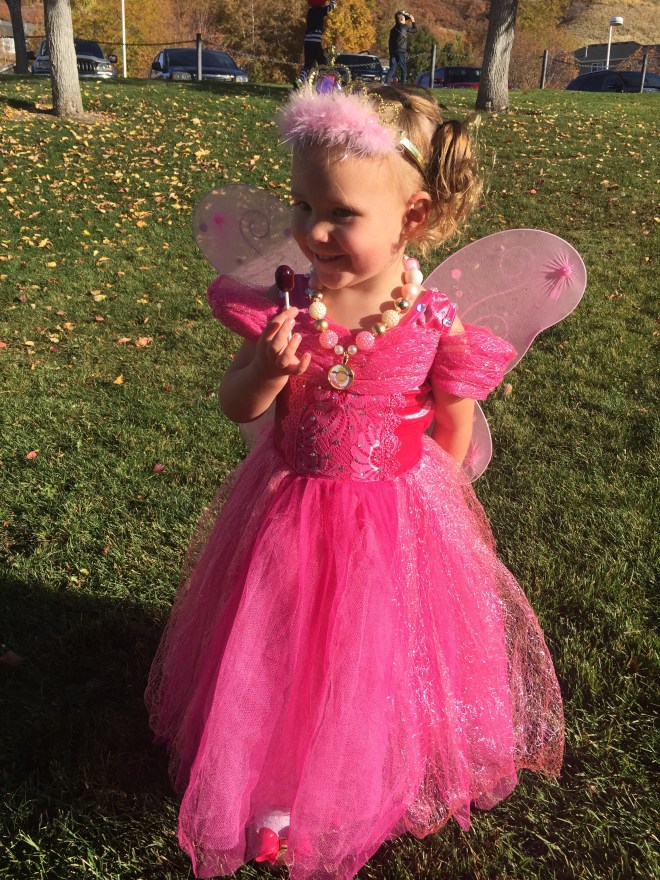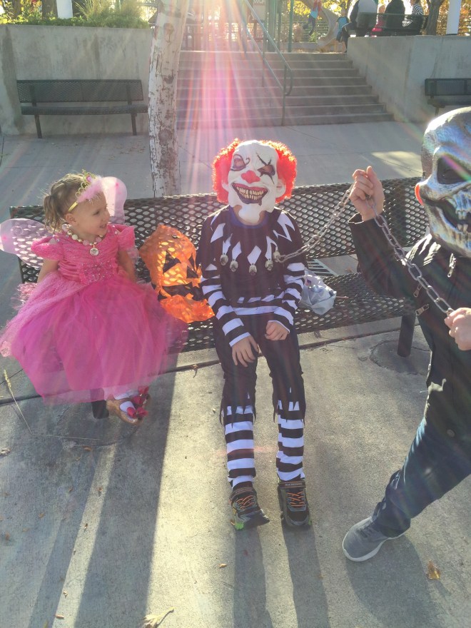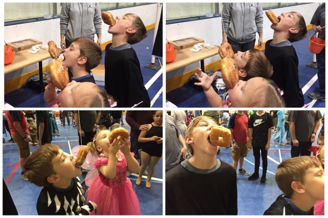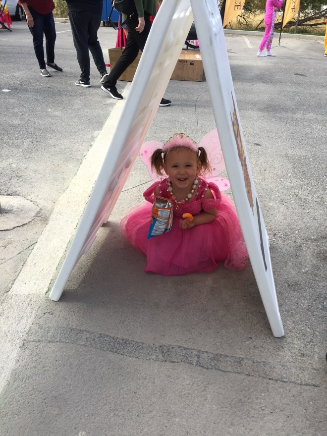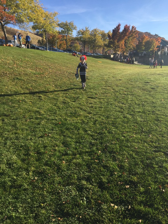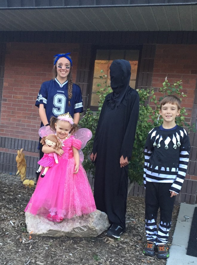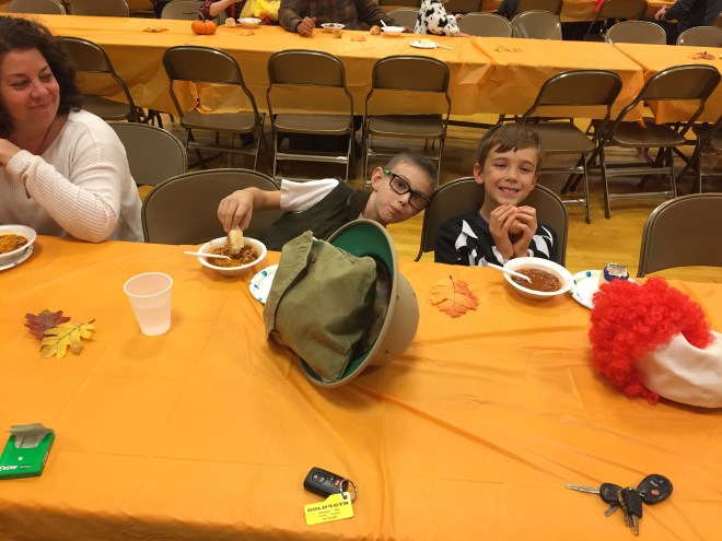 The crew dressed up: A football player, a ghost, a scary clown, and “Princess of Pink” Pinkalicious. The boys were not able to wear their masks because of the very little kids attending. They will wear them the rest of the season though. They are very good sports about it.