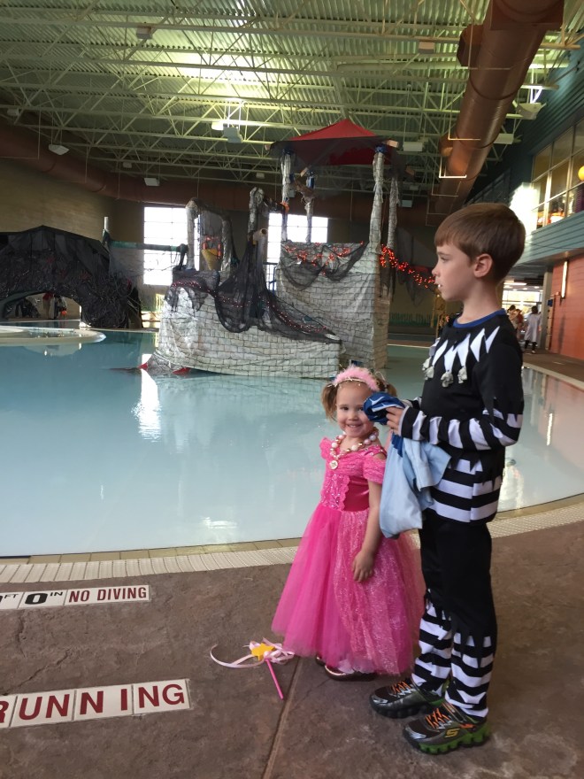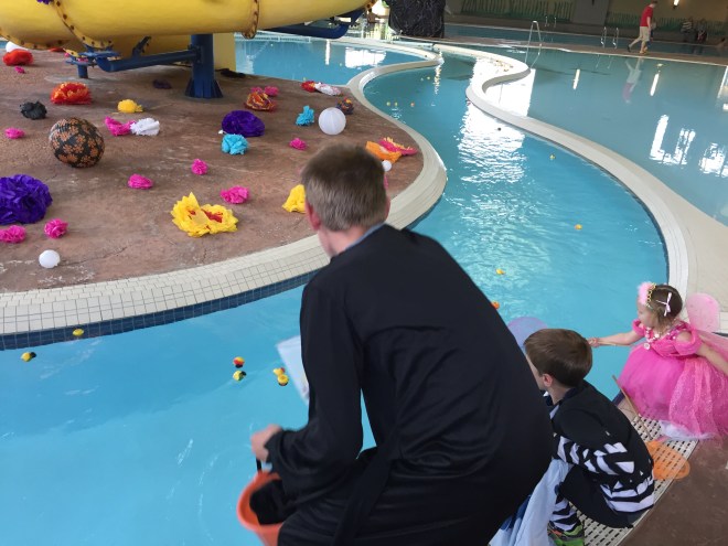 We went to the big rec pool area next, which they had completely decked out. They turned the little kids castle into a spooky haunted castle, and made the bridge into a haunted walk. They also turned the hot tubs into the Evil Witches boiling brew, which included the infamous black poisoned apples and bubbling green potion. (I wanted to get a picture of it, but was too nervous of Lucy taking a plunge in head first.)
