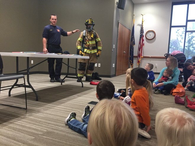 Today at storytime, the Kaysville Fire Department came to visit the kids. After Miss Sarah read some books about fire trucks, the firemen talked with the kids about fire safety, exit plans, and not being afraid of them if there is a fire.