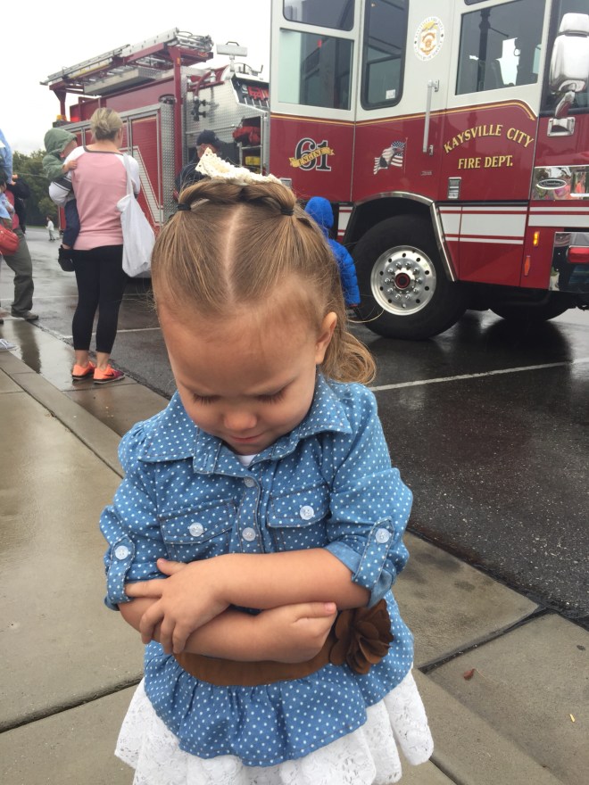 They demonstrated how they put on all their fire fighting gear and reinforced that it is still the same nice fireman underneath all that protective gear. Lucy thought it was funny that the fireman’s name was Nate. It didn’t matter when he tried to give her a high five fully suited though. She wanted nothing to do with him. We’ll have to keep talking about not being afraid of firemen in gear.