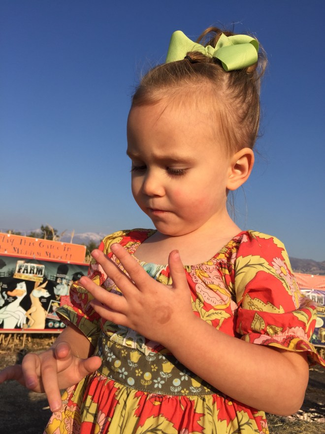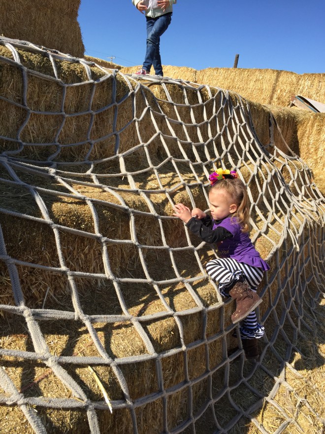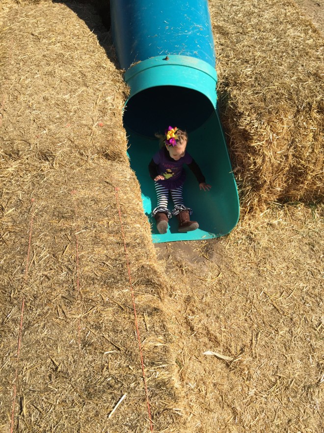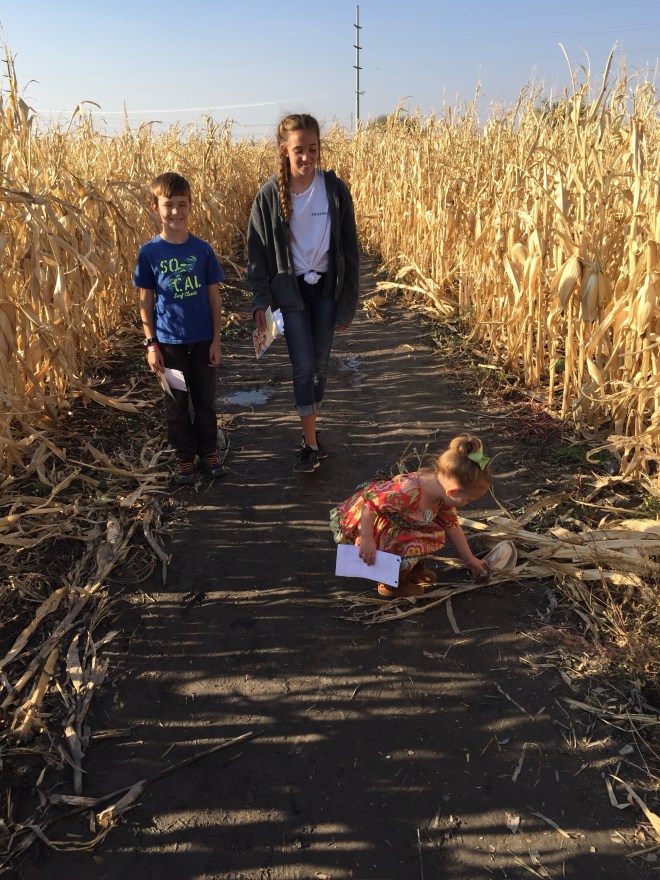 The corn maze was not a very good success. I was trying to show Lucy how the corn grows on the stalk. One ear of corn was hanging out of the husk. I told Lucy, “Feel how soft the corn is.” Yeah, she proceeded to rub her hand down the ear of corn along the husk and sliced her hand open. I don’t think I’ll ever hear the end of that. I ended up having to carry her the rest of the way around the maze. Thank goodness we chose the smallest one. (I think we walked a mile and a half before we found our way out.)