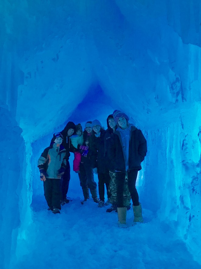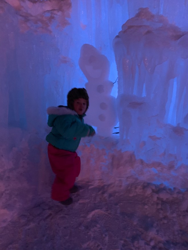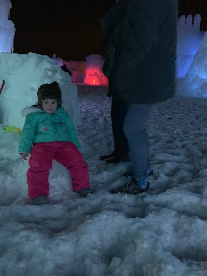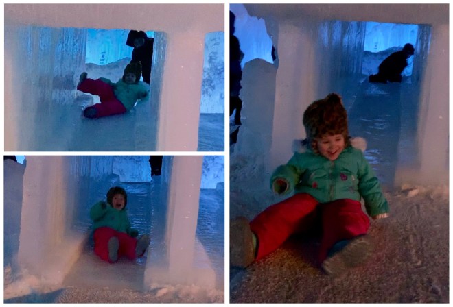 The kids wanted to ride in the ice tunnels, but Lucy was not allowed because she was too little. While they waited in line, we found a tunnel just Lu’s size.