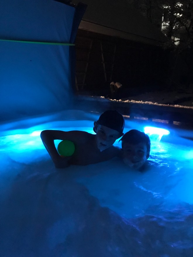 Aidan has been begging for Alex to come in his hot tub since they moved in next door. With Alex being sick so often, we have held off a lot. Tonight, however, we finally let him go. Snow on the ground and all! They had a blast! (Until it was time to get out.☃️) These little boys are such good buddies. It’s going to be hard to move away.