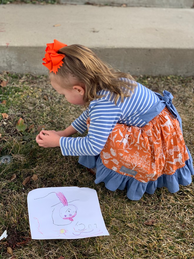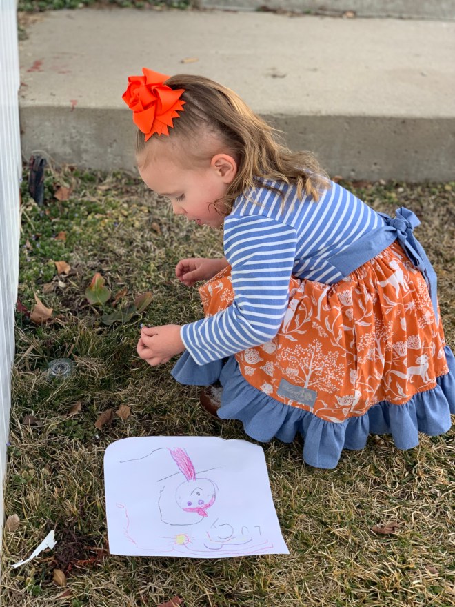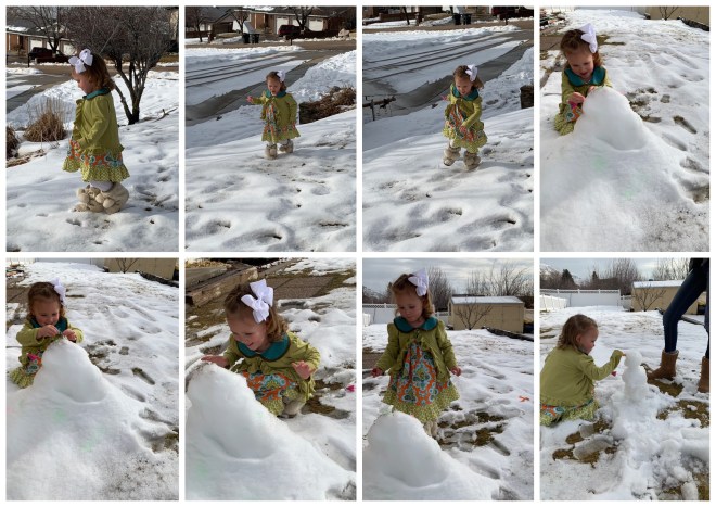 Lucy loves finding little flowers growing out of the snow in Uncle Eric’s yard. After church, Lucy took one of her exploring trips to find her purple flowers.