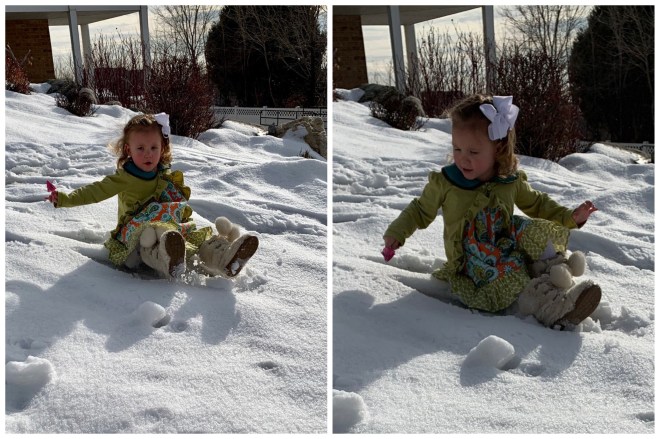 After getting out of the van, i told Lucy to stop so I could take a picture of her in the snow. Mid-smile/picture snap, Lucy slipped and wiped out in the snow. She was quite shocked.